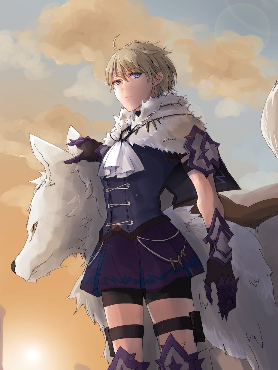1girl animal armor ascot blonde_hair blue_eyes closed_mouth fire_emblem fire_emblem_engage fur_trim gloves highres looking_at_viewer merrin_(fire_emblem) nintendo robaco short_hair shorts shorts_under_skirt skirt solo thigh_strap wolf