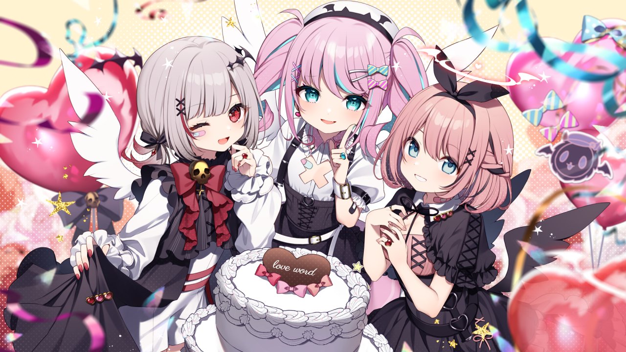 3girls ai_kotoba_iv_(vocaloid) bandaged_horn bat_hair_ornament blue_eyes cake dress dtto. food hair_ornament hazakura_chikori jacket looking_at_viewer multicolored_hair multiple_girls one_eye_closed open_mouth otokado_ruki pink_hair red_eyes scarz smile tulsi_nightmare utaite vee_(vtuber) virtual_youtuber vocaloid white_hair x_hair_ornament