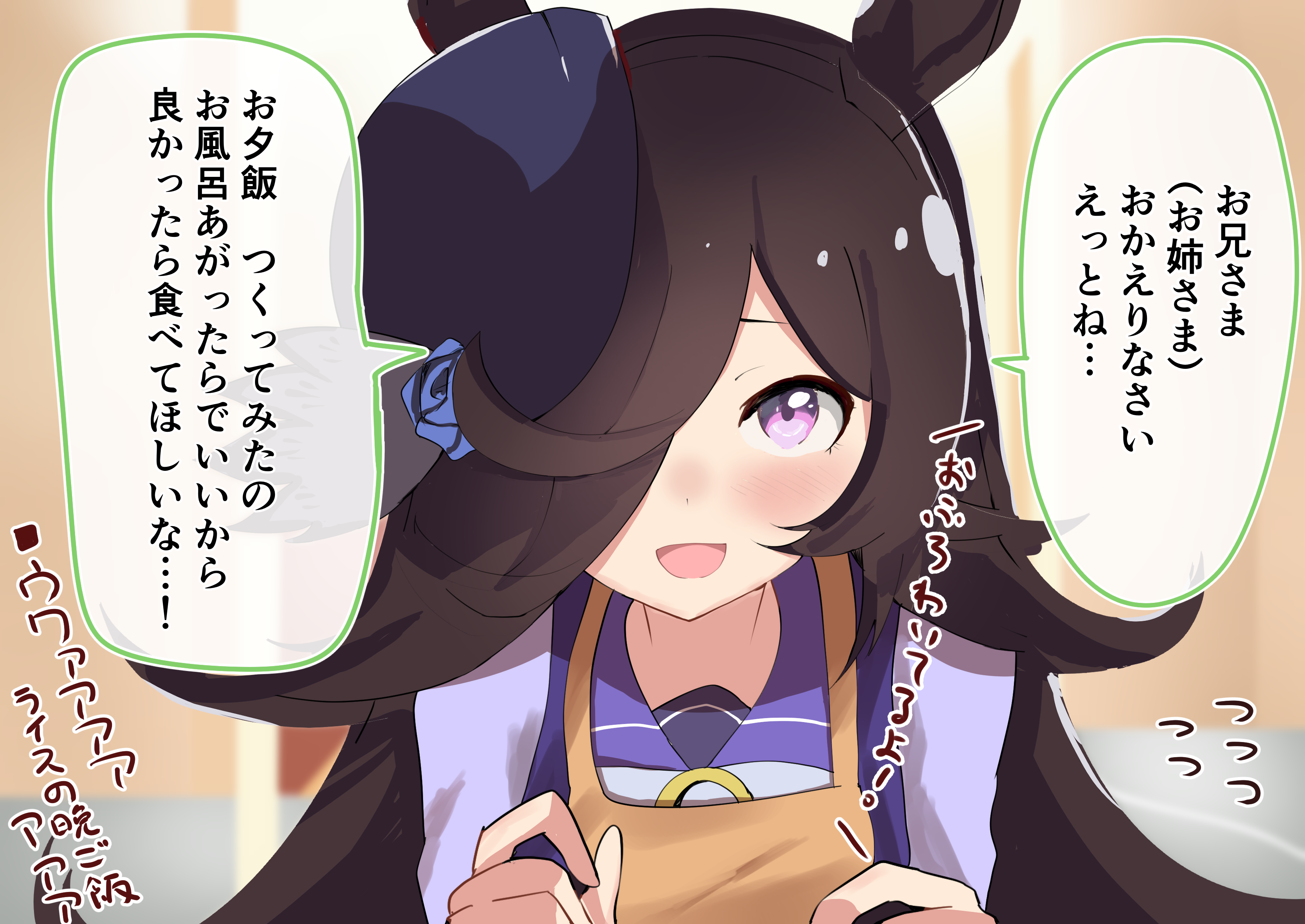 1girl absurdres animal_ears apron black_hair blue_flower blue_hat blue_rose blue_shirt blurry blurry_background blush commentary flower flying_sweatdrops hair_over_one_eye hat hat_flower highres horse_ears horse_girl long_bangs long_hair looking_at_viewer purple_eyes purple_sailor_collar rice_shower_(umamusume) rose sailor_collar school_uniform serafuku shinkon_santaku shirt smile solo takinii tilted_headwear tracen_school_uniform translated umamusume yellow_apron