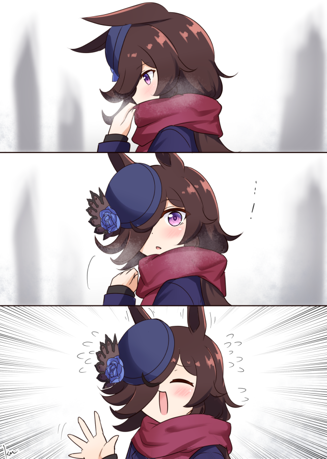 ... 1girl 3girls :d ? adjusting_scarf artist_name blue_coat blue_flower blue_headwear blue_rose breath closed_eyes coat comic commentary ears_down ears_up emphasis_lines flower flying_sweatdrops hat hat_flower horse_girl kimukimu long_bangs long_hair long_sleeves looking_at_viewer looking_to_the_side motion_lines multiple_girls open_mouth parted_lips purple_eyes purple_scarf rice_shower_(umamusume) rose scarf signature silent_comic smile spoken_ellipsis spoken_question_mark tilted_headwear umamusume
