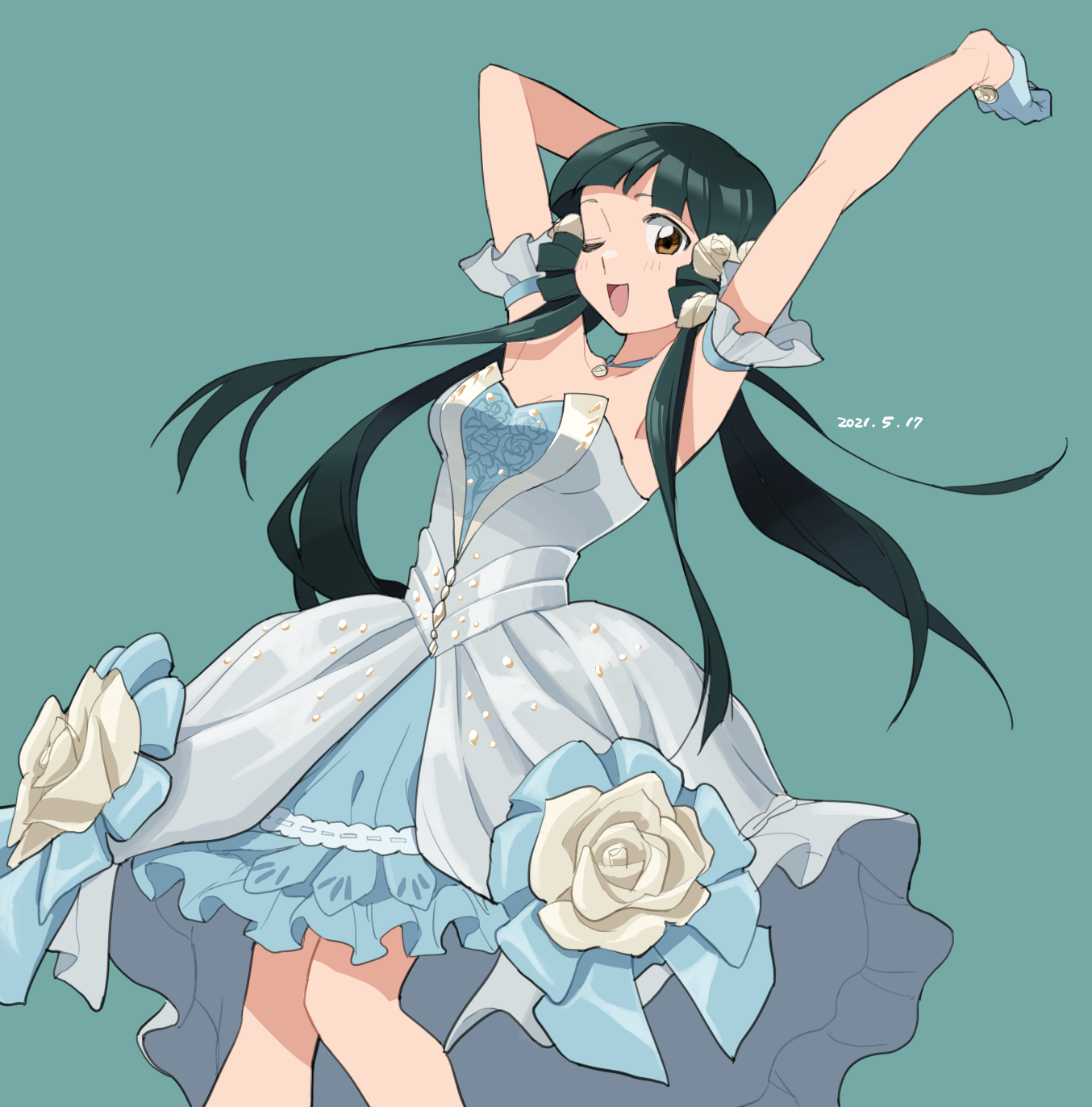 1girl ;d armpits arms_up blue_gloves blue_hair blush breasts cleavage dress floral_print flower frilled_dress frills gloves green_background hair_flower hair_ornament highres idolmaster idolmaster_million_live! idolmaster_million_live!_theater_days kitakami_reika layered_dress long_hair looking_at_viewer low_twintails medium_breasts one_eye_closed open_mouth pendant_choker scrunchie simple_background smile solo tarako_oniyon twintails very_long_hair white_dress