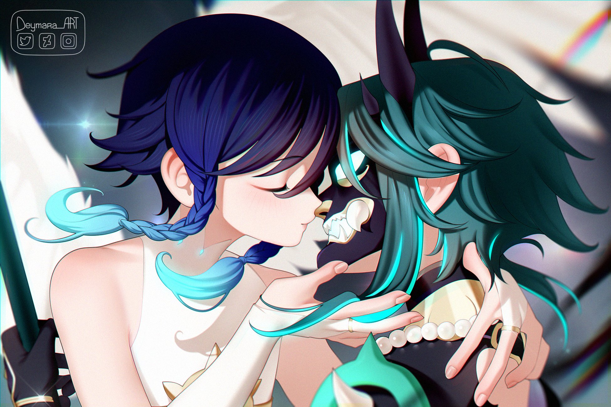 2boys androgynous bead_necklace beads black_gloves black_hair blue_hair braid bridal_gauntlets crop_top deymara feathered_wings genshin_impact gloves glowing glowing_hair gradient_hair green_hair highres imminent_kiss jewelry male_focus mask multicolored_hair multiple_boys necklace official_alternate_costume oni_mask primordial_jade_winged-spear_(genshin_impact) ring short_hair_with_long_locks twin_braids venti_(archon)_(genshin_impact) venti_(genshin_impact) white_wings wings xiao_(genshin_impact) yaoi