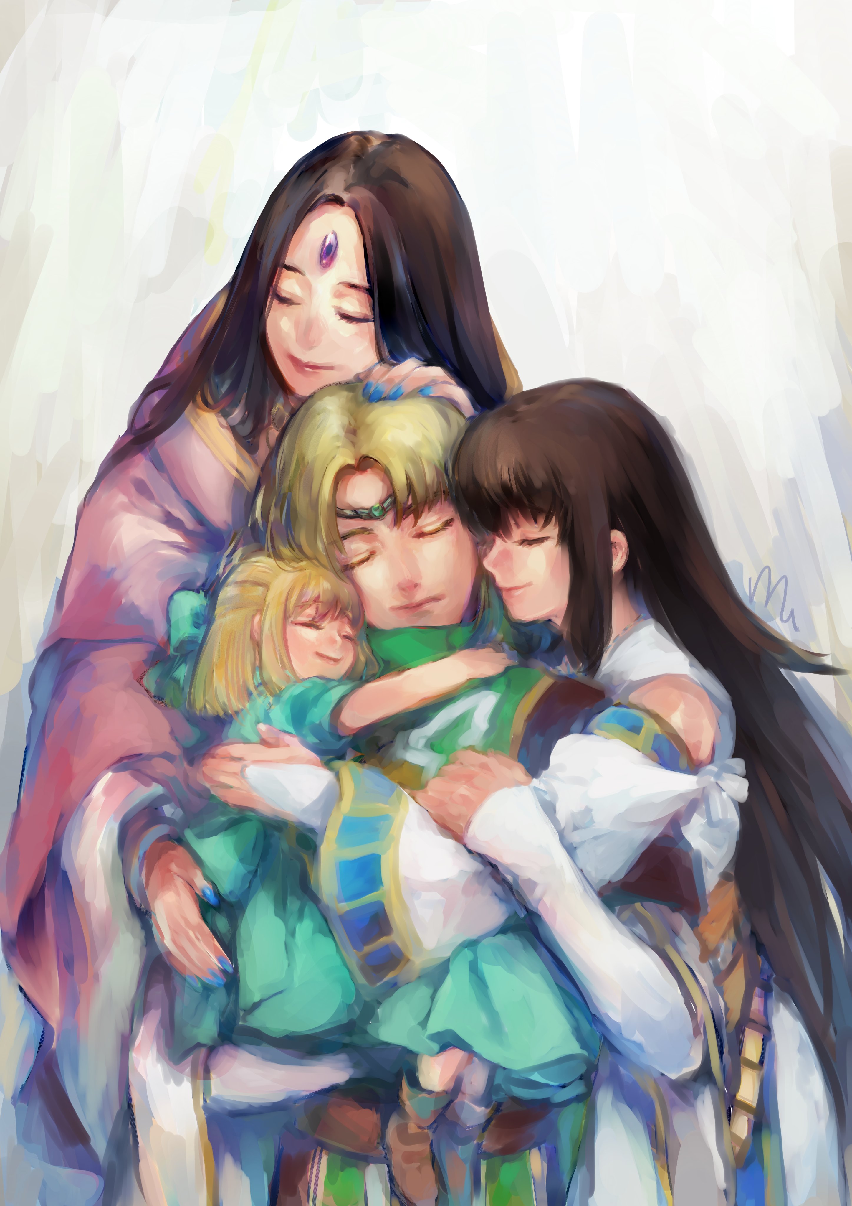 absurdres black_hair blonde_hair brown_hair closed_eyes forehead_jewel gensou_suikoden gensou_suikoden_iii group_hug highres hug ikunosake leknaat light_smile long_hair long_sleeves luc_(suikoden) multiple_girls sarah_(suikoden_iii) viki_(suikoden)