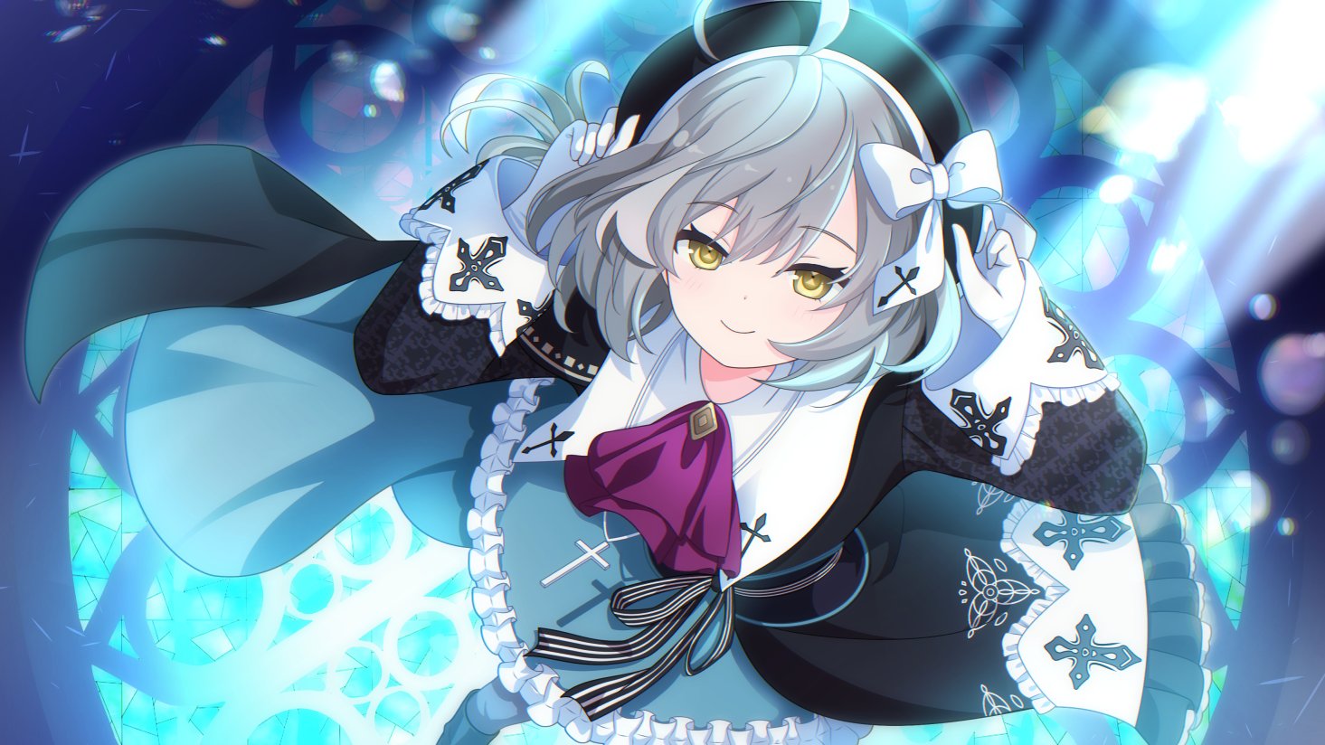 1girl adjusting_clothes adjusting_headwear ahoge aqua_cape aqua_dress arms_up ascot assault_lily asymmetrical_clothes beret black_boots black_cape black_dress black_hat black_pantyhose black_ribbon boots bow cape closed_mouth commentary_request cross cross_necklace cross_print dress frilled_dress frilled_sleeves frills from_above gloves grey_hair hair_between_eyes hat hat_bow indoors jewelry latin_cross layered_dress light_blush long_hair long_sleeves looking_at_viewer looking_up moonlight multicolored_hair necklace pantyhose pink_ascot print_bow print_dress renea0222 ribbon sasaki_ran smile solo stained_glass standing streaked_hair striped_ribbon two-sided_cape two-sided_fabric two-tone_dress white_bow white_gloves white_ribbon wide_sleeves yellow_eyes