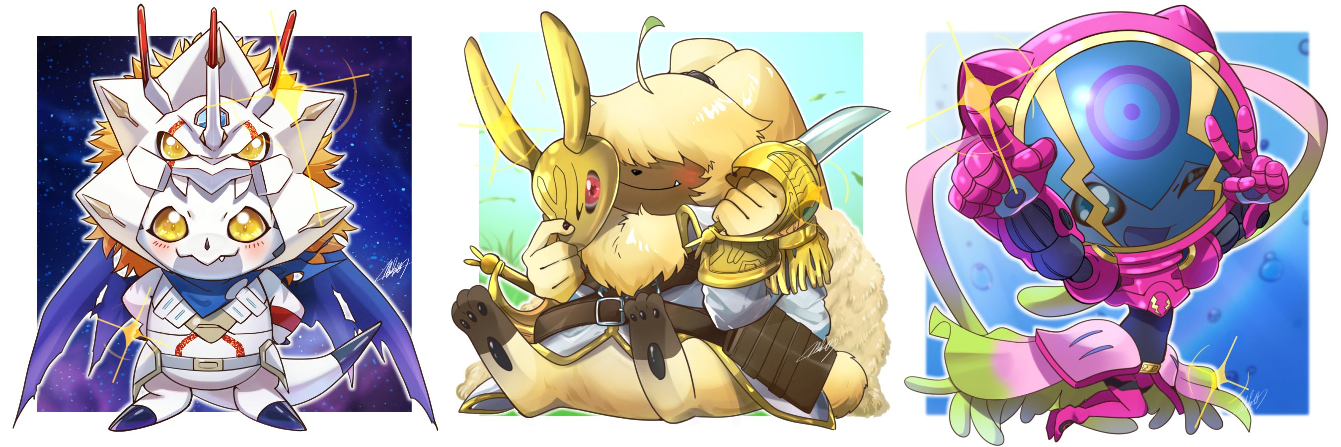 amphimon amphimon_(cosplay) angoramon cosplay diarbbitmon diarbbitmon_(cosplay) digimon dinosaur gammamon highres jellyfish jellyfish_girl jellymon monster_girl rabbit siriusmon siriusmon_(cosplay) tentacle_hair tentacles
