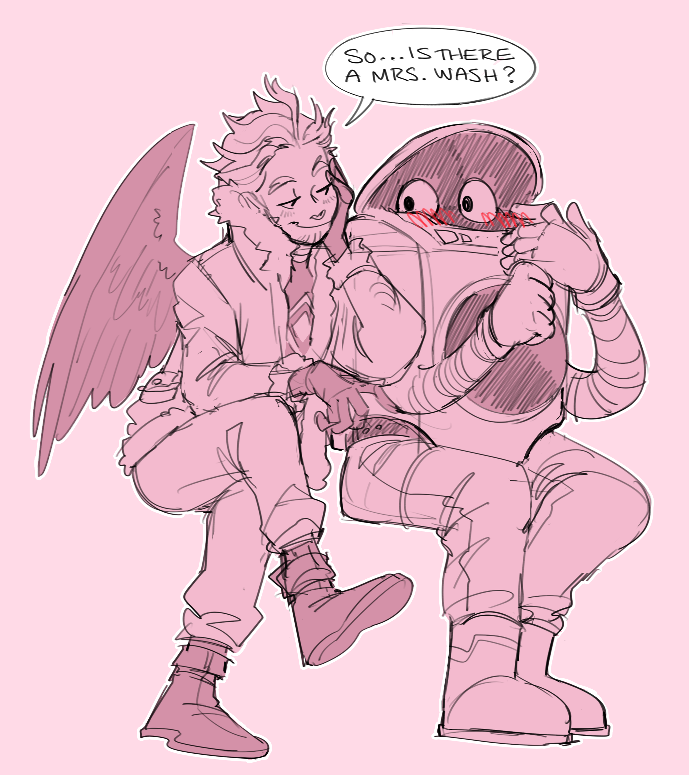 2boys absurdres blush boku_no_hero_academia boots closed_mouth commentary english_commentary english_text facial_hair feathered_wings full_body gloves habkart hawks_(boku_no_hero_academia) head_rest highres jacket looking_at_another male_focus monochrome multiple_boys pants pink_background pink_theme short_hair simple_background sitting sketch smile speech_bubble stubble wash_(boku_no_hero_academia) washing_machine wings yaoi