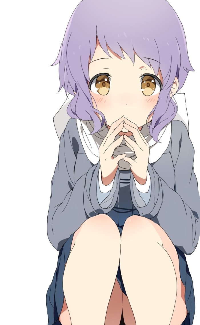 1girl blue_sky blush commentary dot_nose grey_jacket hands_up idolmaster idolmaster_million_live! jacket legs long_sleeves looking_at_viewer makabe_mizuki mochigome_(ununquadium) own_hands_together purple_hair scarf short_hair sidelocks sky solo squatting thighs wavy_hair white_background white_scarf yellow_eyes