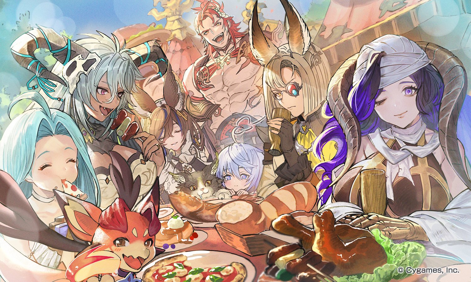 3boys 6+girls ^_^ ahoge apple aqua_hair artist_request bandages black_hair blue_eyes blue_hair bowl_cut bread breasts brown_eyes brown_hair closed_eyes cup draph erune ewiyar_(granblue_fantasy) fangs fediel_(granblue_fantasy) fingerless_gloves fish fish_(food) food fruit galleon_(granblue_fantasy) glasses gloves granblue_fantasy green_hair grin hair_ornament head_rest horns jewelry large_breasts light_blue_hair long_hair lu_woh_(granblue_fantasy) lyria_(granblue_fantasy) margherita_pizza meat multicolored_hair multiple_boys multiple_girls official_art one_eye_closed open_mouth orologia_(female) pink_eyes pizza purple_hair red_hair ring shish_kebab skull_hair_ornament smile streaked_hair upper_body vyrn_(granblue_fantasy) wamdus_(granblue_fantasy) wilnas_(granblue_fantasy) yellow_eyes