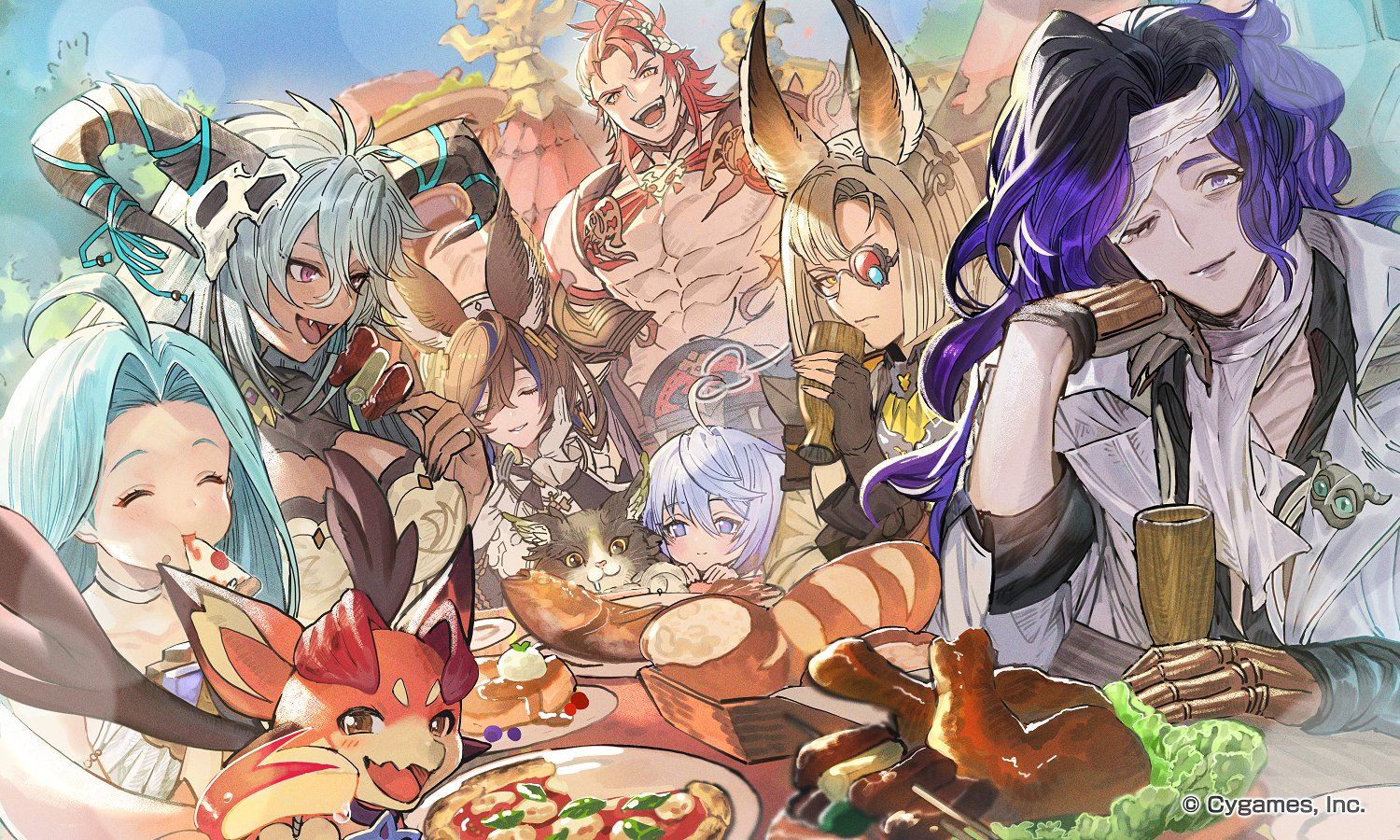 4boys 5girls ^_^ ahoge apple aqua_hair artist_request black_hair blue_eyes blue_hair bowl_cut bread breasts brown_eyes brown_hair closed_eyes cup draph erune ewiyar_(granblue_fantasy) fangs fediel_(granblue_fantasy) fingerless_gloves fish fish_(food) food fruit galleon_(granblue_fantasy) glasses gloves granblue_fantasy green_hair grin hair_ornament head_rest horns jewelry large_breasts light_blue_hair long_hair lu_woh_(granblue_fantasy) lyria_(granblue_fantasy) margherita_pizza meat multicolored_hair multiple_boys multiple_girls official_art one_eye_closed open_mouth orologia_(male) pink_eyes pizza purple_eyes purple_hair red_hair ring shish_kebab skull_hair_ornament smile streaked_hair upper_body vyrn_(granblue_fantasy) wamdus_(granblue_fantasy) wilnas_(granblue_fantasy) yellow_eyes