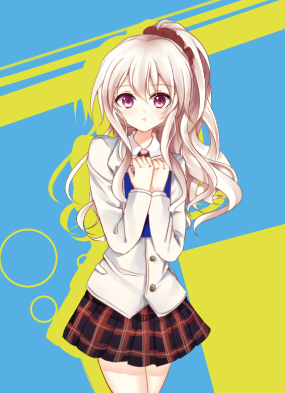 1girl black_skirt blazer blue_background book bow buttons circle collared_shirt commentary cowboy_shot expressionless hair_between_eyes hair_ornament hair_scrunchie holding holding_book hugging_object jacket kagerou_project kozakura_marry long_hair long_sleeves looking_at_viewer mekakucity_actors miniskirt mnyang multicolored_skirt necktie parted_lips pink_eyes plaid_clothes plaid_skirt pleated_skirt ponytail red_bow red_necktie red_skirt scrunchie shirt skirt solo two-tone_background wavy_hair white_hair white_jacket white_shirt yellow_background