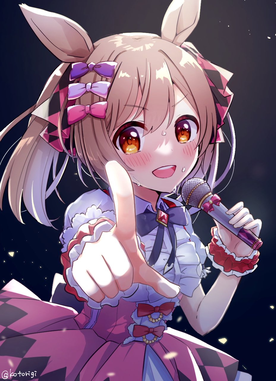 1girl :d animal_ears blush bow brown_hair dress frilled_dress frills highres holding holding_microphone horse_ears horse_girl kotorigi_yotsuba medium_hair microphone open_mouth orange_eyes pink_bow purple_bow short_sleeves smart_falcon_(love_4ever)_(umamusume) smart_falcon_(umamusume) smile solo sweat umamusume upper_body v-shaped_eyebrows white_dress