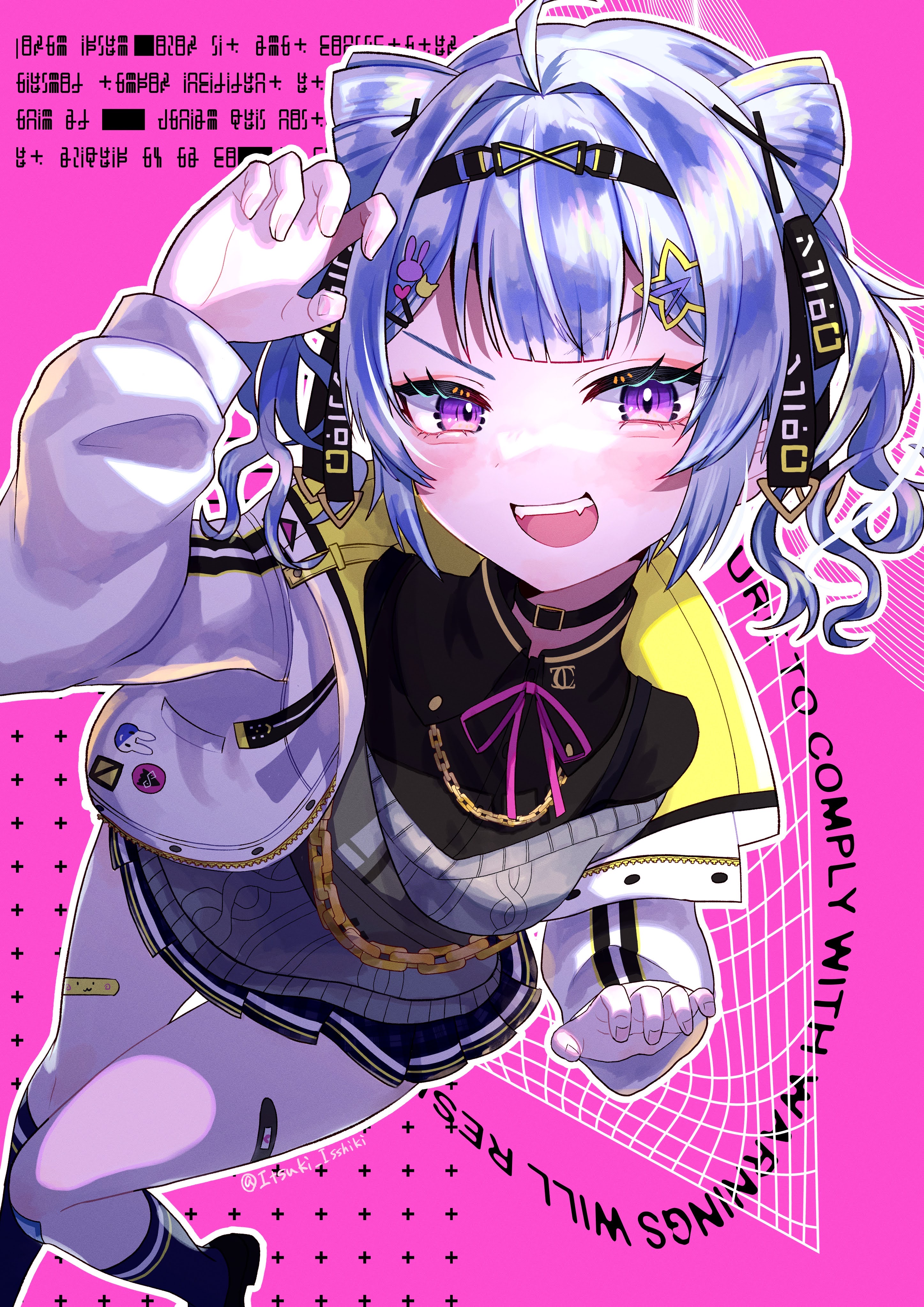 1girl absurdres ahoge aran_sweater bandaid bandaid_on_leg black_shirt breasts cable_knit chain choker cone_hair_bun double_bun english_text fangs foreshortening from_above grey_hair grey_sweater hair_bun hair_intakes hair_ornament hairband hairclip high_collar highres itsuki_isshiki jacket light_blush looking_at_viewer medium_hair miniskirt neck_ribbon nijisanji nijisanji_en open_clothes open_jacket open_mouth pleated_skirt popped_collar purple_eyes raised_eyebrow ribbon shirt simple_background skirt small_breasts smile socks solo sweater thick_eyelashes thigh_gap two_side_up virtual_youtuber wavy_hair zaion_lanza