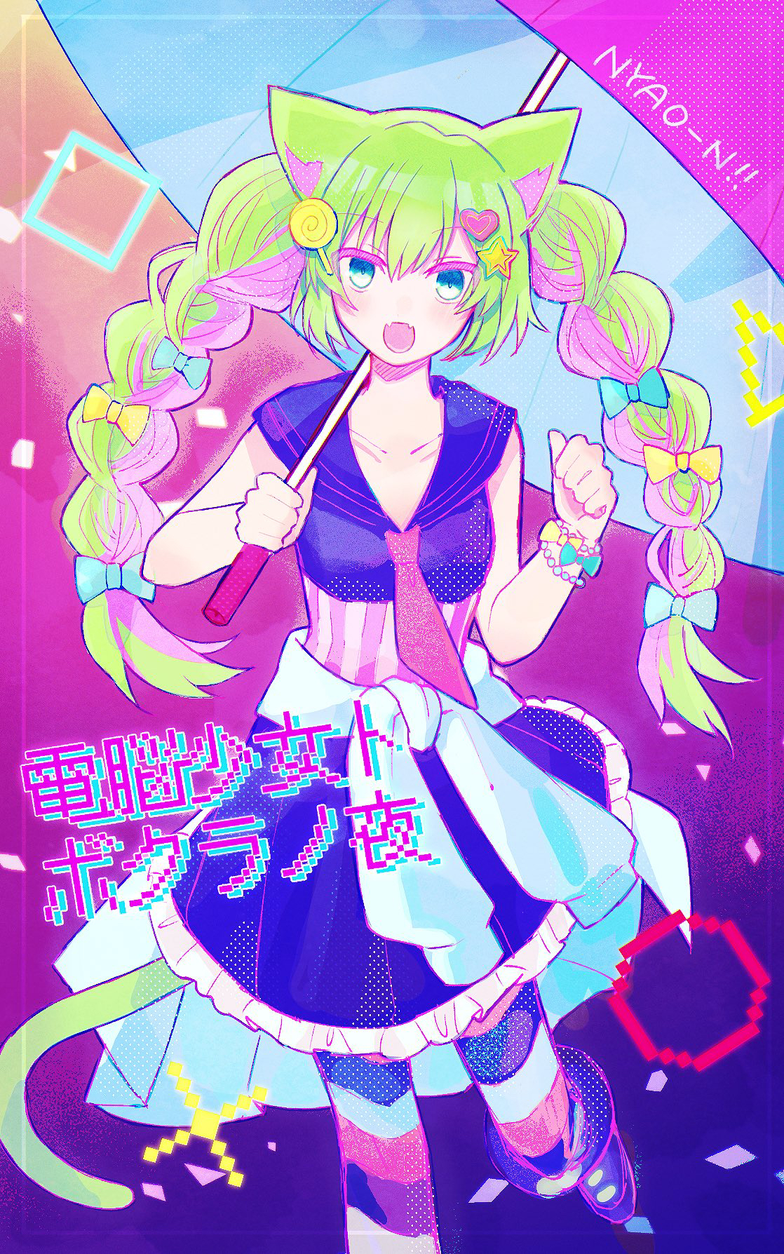 1girl animal_ears bakara_(19083210) black_dress blue_eyes bracelet braid cat_ears cat_girl cat_tail dress gradient_background hair_ornament heart heart_hair_ornament highres jewelry kamiki_ritsu light_green_hair lollipop_hair_ornament looking_at_viewer multicolored_background multicolored_hair necktie official_alternate_costume official_alternate_hairstyle ookami_game_(studio_wasabi) pink_background pink_hair purple_background red_necktie short_sleeves solo star_(symbol) star_hair_ornament tail translation_request twin_braids