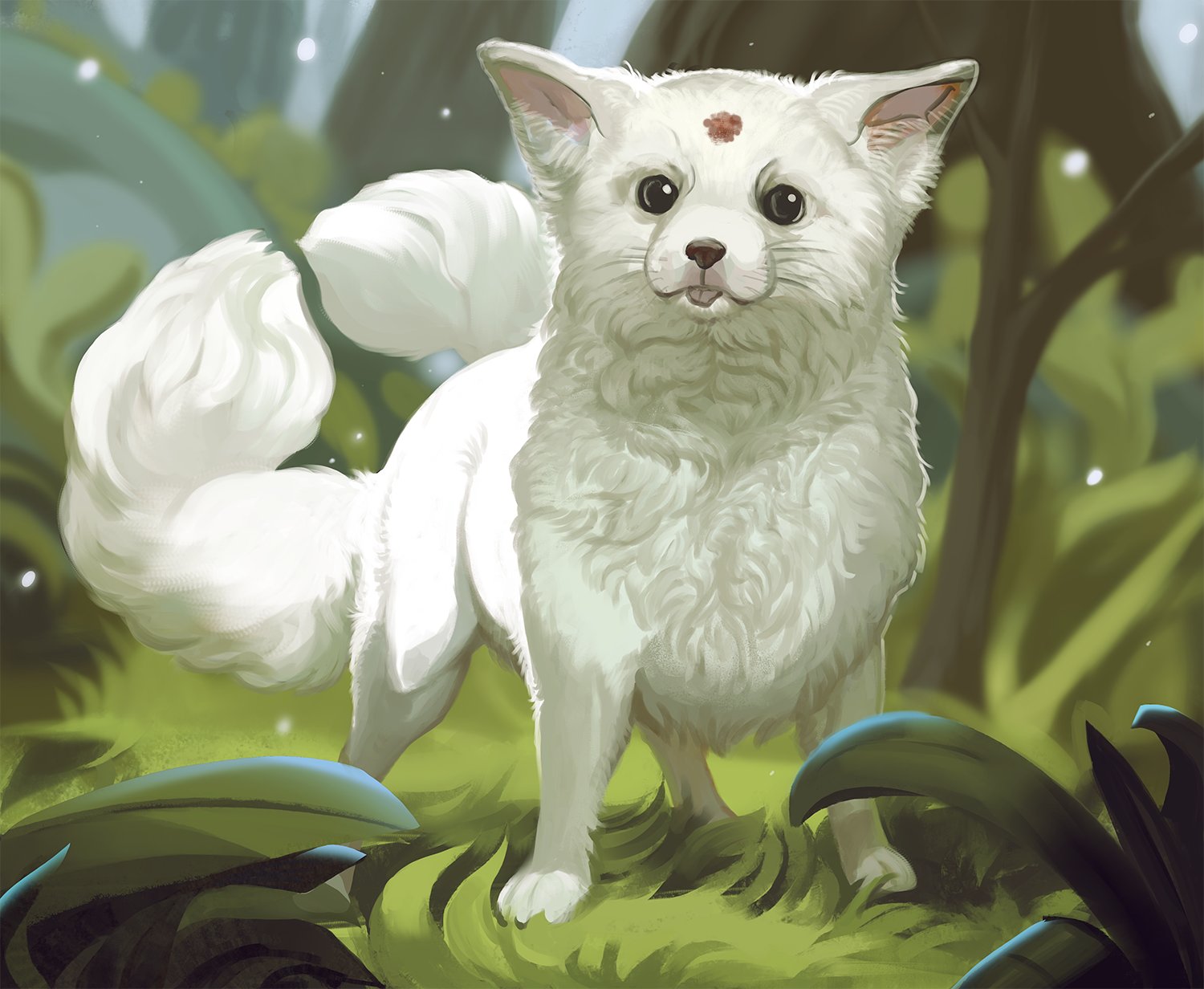 animal animal_focus commentary cub english_commentary forest fox grass highres juno_viinikka kitsune light_particles looking_at_viewer multiple_tails nature no_humans on_ground original outdoors sparkling_eyes tail tongue tongue_out tree two_tails whiskers white_fur