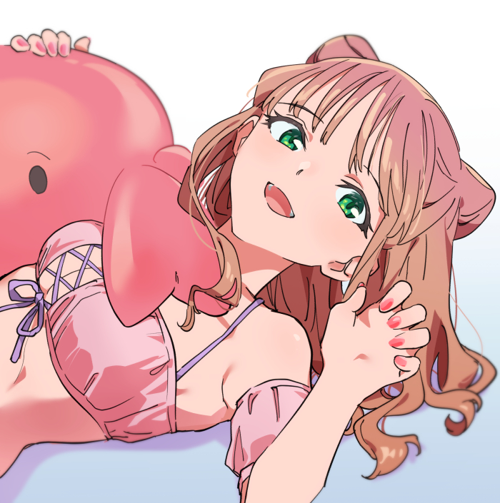 1girl alternate_hairstyle bare_shoulders bikini breasts brown_hair doll green_eyes gridman_universe gridman_universe_(movie) long_hair looking_at_viewer lying medium_breasts minami_yume open_mouth shirop_imas smile solo ssss.dynazenon swimsuit