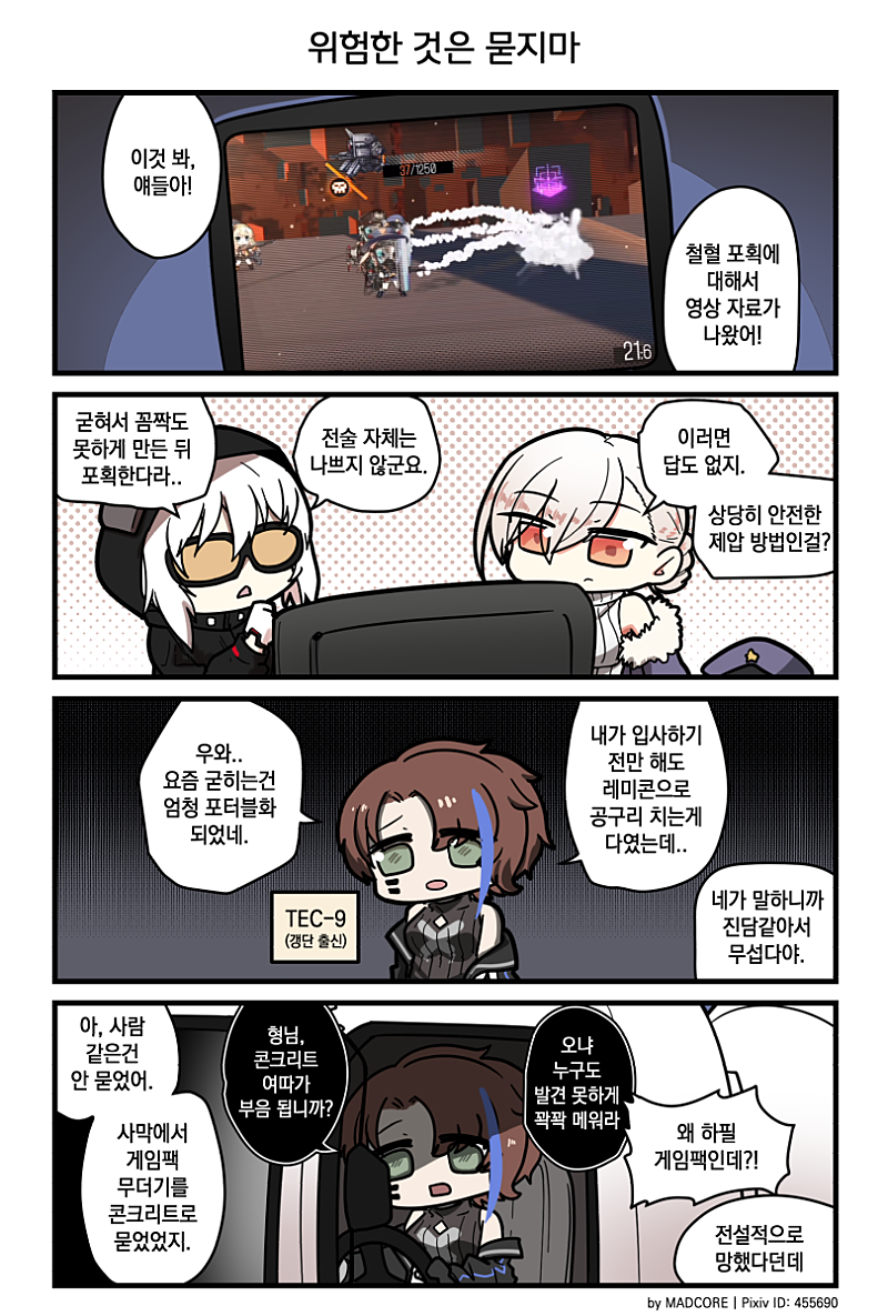 4koma artist_name black_hoodie black_jacket blue_hair brown_hair chibi clip_studio_paint_(medium) closed_mouth comic commentary_request driving facial_mark foam fur-trimmed_jacket fur_trim game_screenshot_inset gameplay_mechanics girls'_frontline green_eyes hair_between_eyes hat head_out_of_frame hood hoodie jacket korean_commentary korean_text ksg_(girls'_frontline) madcore monitor multicolored_hair non-humanoid_robot off_shoulder open_mouth orange_eyes pixiv_id police_hat prowler_(girls'_frontline) ribbed_sweater rmb-93_(girls'_frontline) robot sangvis_ferri short_hair sleeveless sleeveless_turtleneck streaked_hair super-shorty_(girls'_frontline) sweater tec-9_(girls'_frontline) tinted_eyewear translation_request turtleneck white_hair yellow-tinted_eyewear