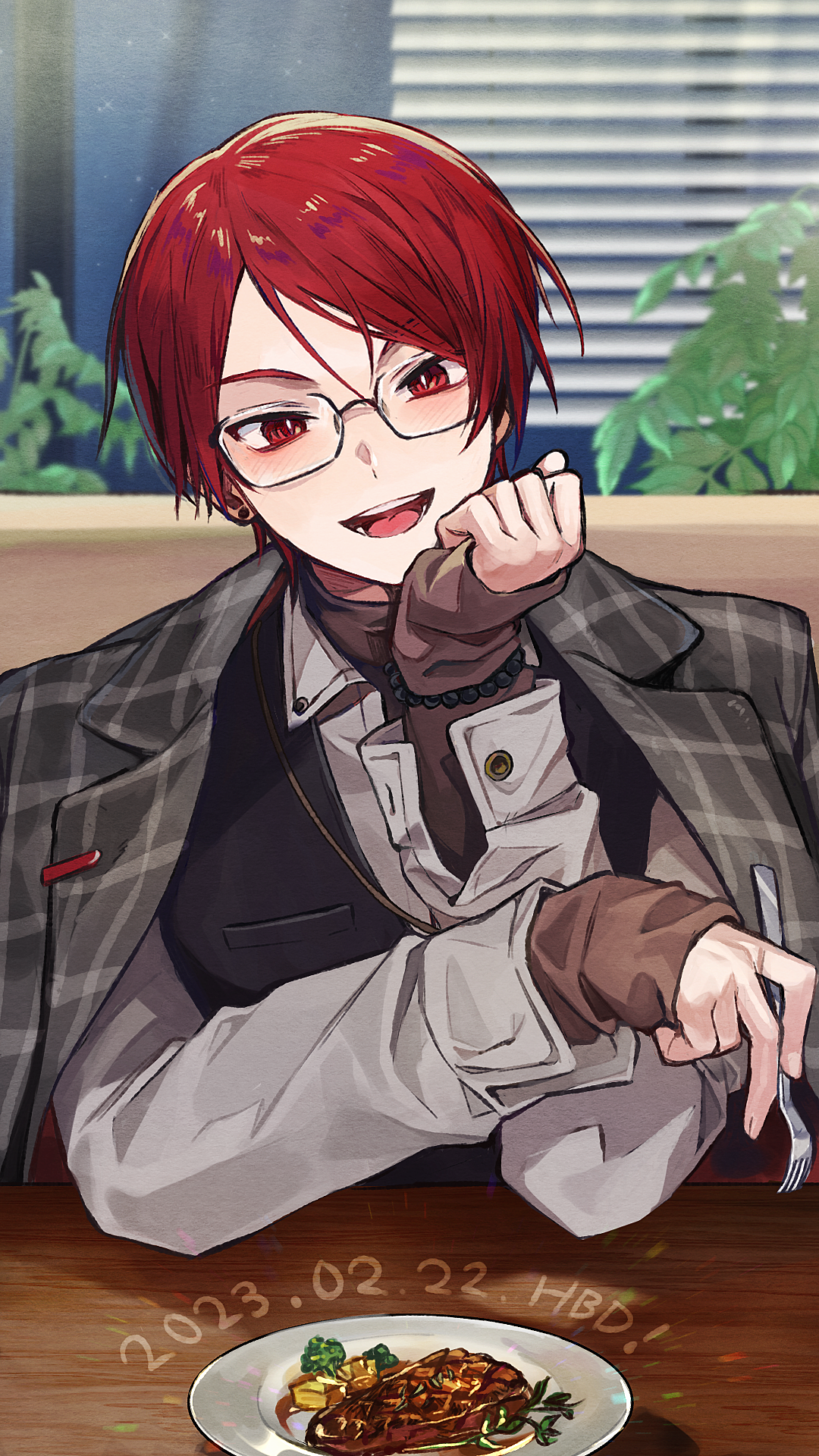 1boy black_vest brown_shirt collared_shirt creepyday dated earrings food fork glasses grey_jacket grey_shirt happy_birthday head_rest head_tilt highres holding holding_fork indoors jacket jacket_on_shoulders jewelry layered_sleeves long_sleeves male_focus meat open_collar piece_a_part plaid_clothes plaid_jacket plant plate red_eyes red_hair shirt shirt_under_shirt short_hair sitting sleeves_past_wrists solo steak stud_earrings swept_bangs table teeth turtleneck upper_body vest virtual_youtuber window_blinds wooden_table yuyuya_aka