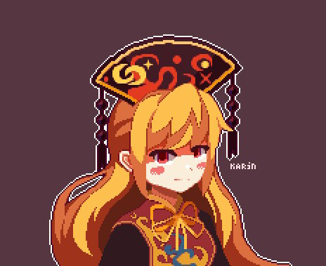 1girl artist_name black_dress black_hat blonde_hair blush bow bowtie breasts brown_background chinese_clothes closed_mouth crescent crescent_print dress hair_between_eyes hat junko_(touhou) kaaaarin long_hair long_sleeves looking_at_viewer lowres mandarin_collar medium_breasts pixel_art pom_pom_(clothes) red_eyes red_tabard sidelocks simple_background smile solo tabard touhou upper_body wide_sleeves yellow_bow yellow_bowtie