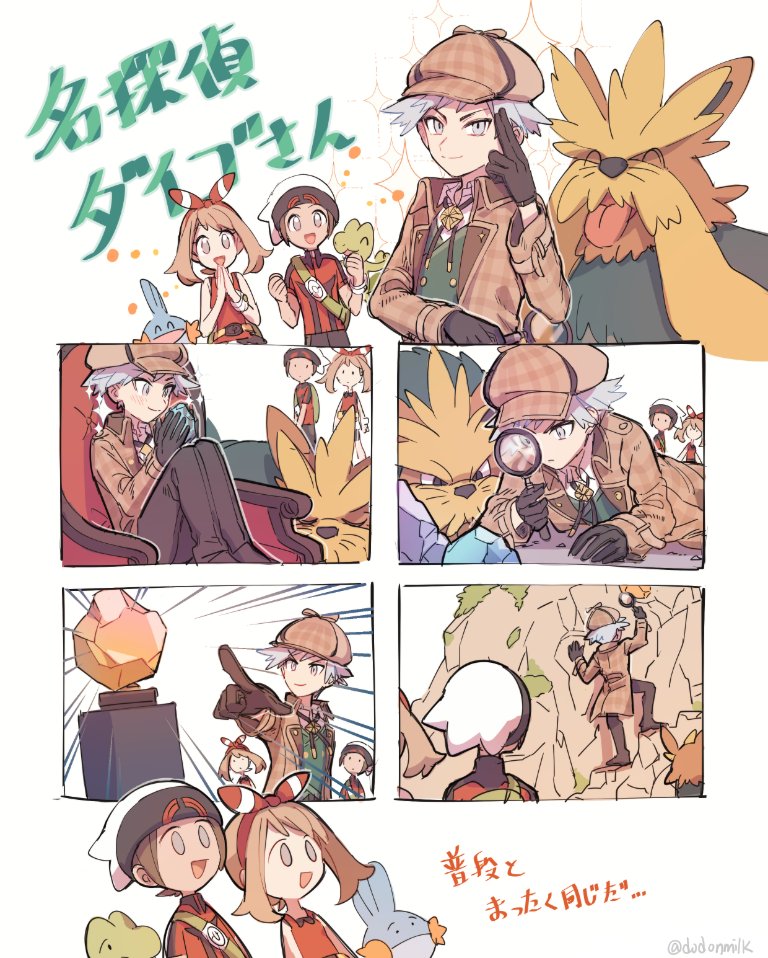 0_0 1girl 2boys alternate_color backpack bag beanie bow_hairband brendan_(pokemon) closed_mouth gen_3_pokemon gen_5_pokemon gloves green_bag green_vest grey_eyes grey_hair hairband hands_up hat holding holding_magnifying_glass huan_li jacket magnifying_glass may_(pokemon) mudkip multiple_boys nintendo official_alternate_costume own_hands_together pants plaid_clothes plaid_headwear pokemon pokemon_(creature) pokemon_masters_ex pokemon_omega_ruby_and_alpha_sapphire red_hairband shiny_pokemon shirt shoes short_hair smile sparkle steven_stone steven_stone_(special_costume) stoutland translation_request treecko vest white_headwear