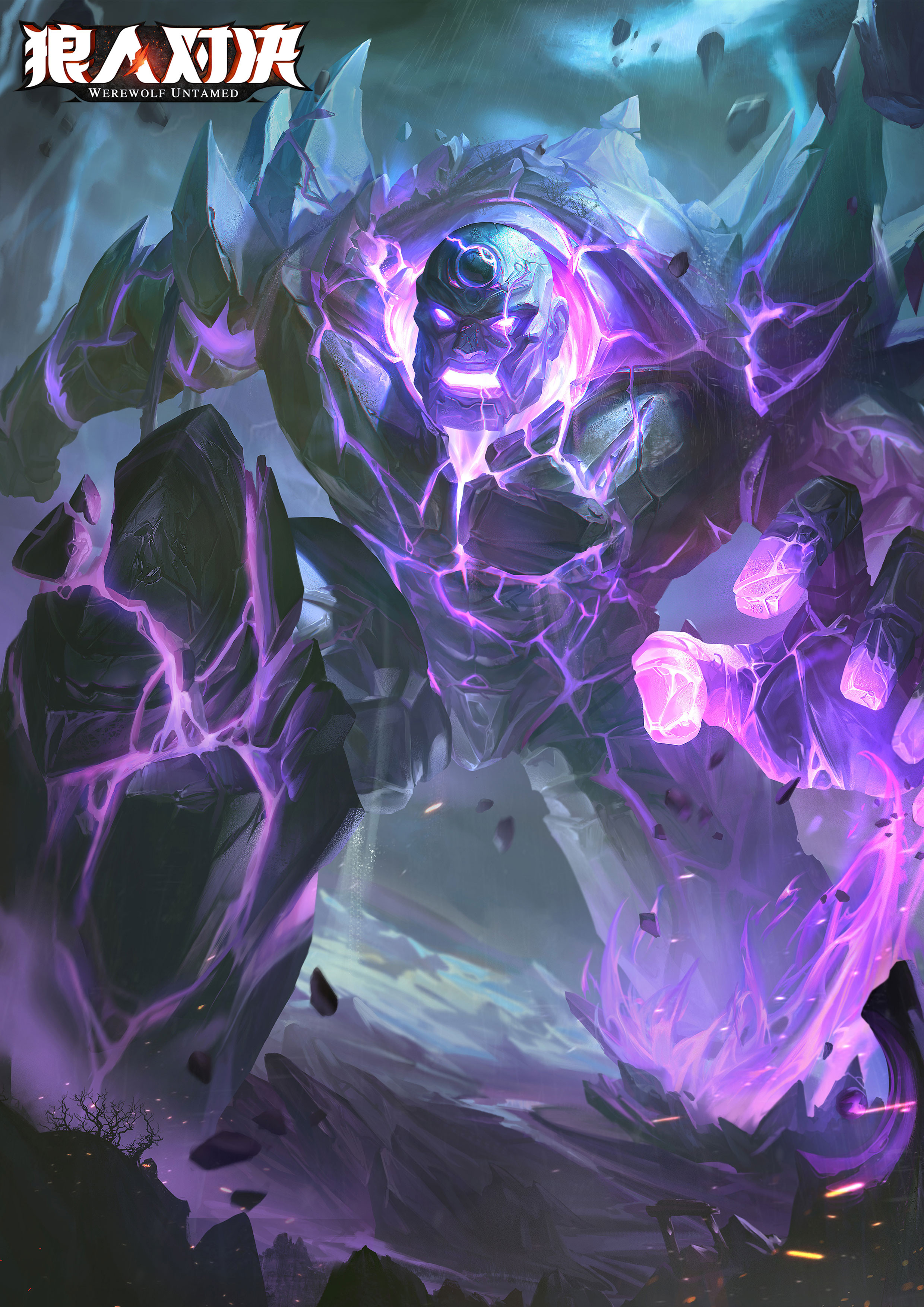 1other absurdres bare_tree copyright_name crystal glowing glowing_eyes golem highres moonlightcat official_art outdoors tree werewolves_untamed