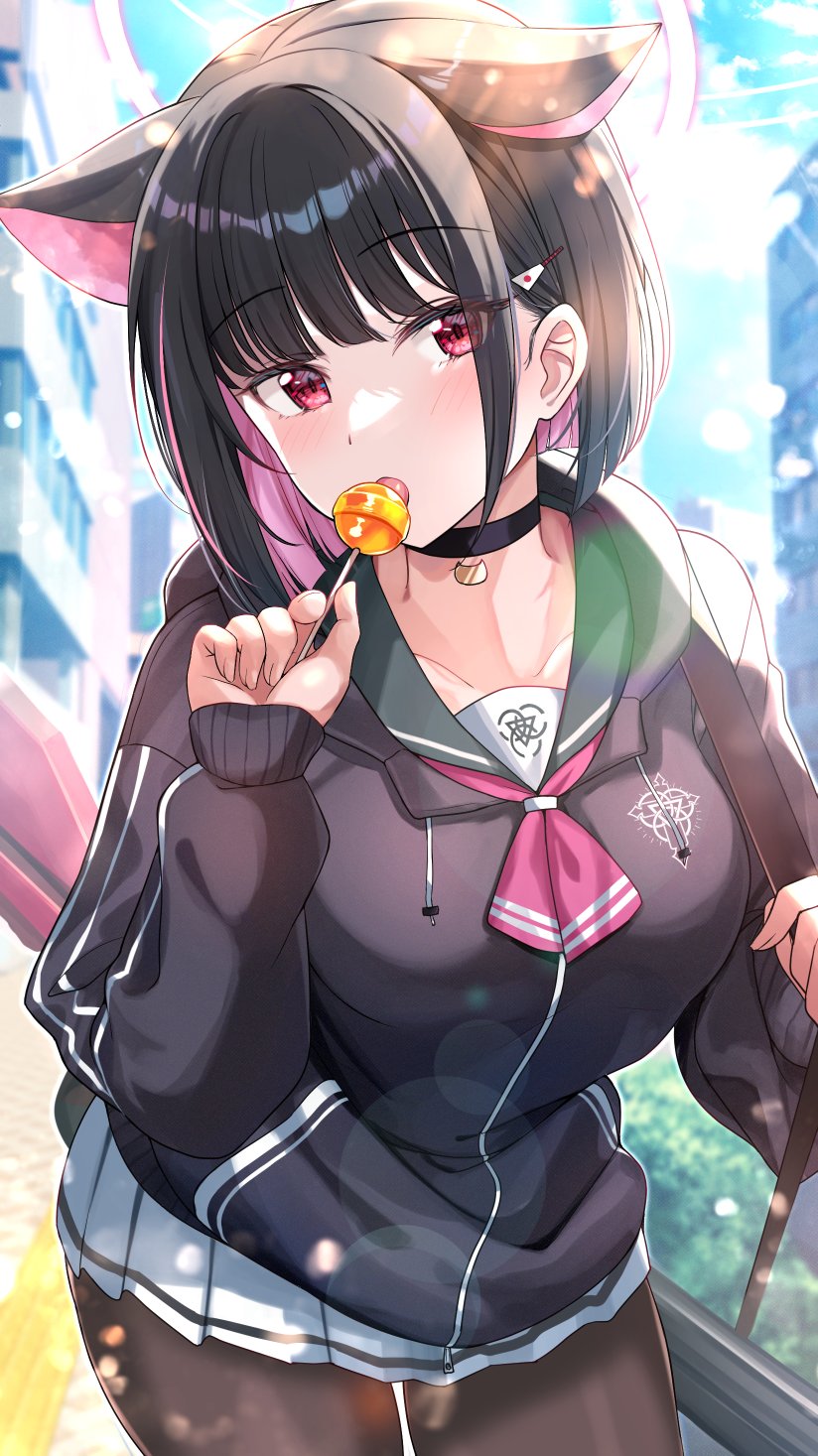 1girl animal_ears black_choker black_hair black_hoodie blue_archive candy cat_ears choker colored_inner_hair food gun highres holding holding_candy holding_food holding_lollipop hood hoodie kazusa_(blue_archive) lollipop multicolored_hair pantyhose pink_hair pleated_skirt red_eyes sailor_collar shiitake_taishi skirt weapon
