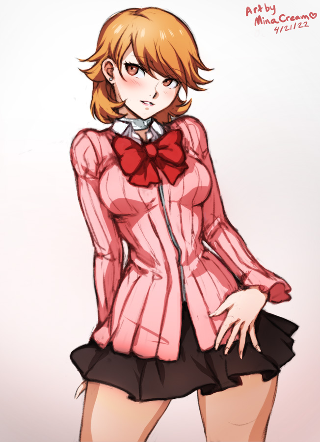 1girl artist_name black_skirt blush bow brown_eyes choker collared_shirt contrapposto dated earrings jewelry light_brown_hair mina_cream persona persona_3 pink_sweater red_bow shirt signature skirt smile stud_earrings sweater takeba_yukari white_choker zipper_top