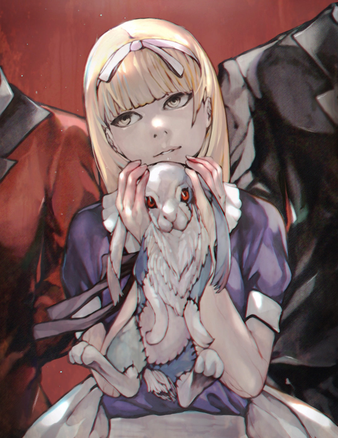 alice_(megami_tensei) animal blonde_hair blunt_bangs demon_(megami_tensei) dress hair_ribbon hairband highres holding holding_animal holding_rabbit long_hair nyami parted_lips purple_dress rabbit red_eyes ribbon shin_megami_tensei shin_megami_tensei:_strange_journey short_sleeves stitched_torso stitches yellow_eyes