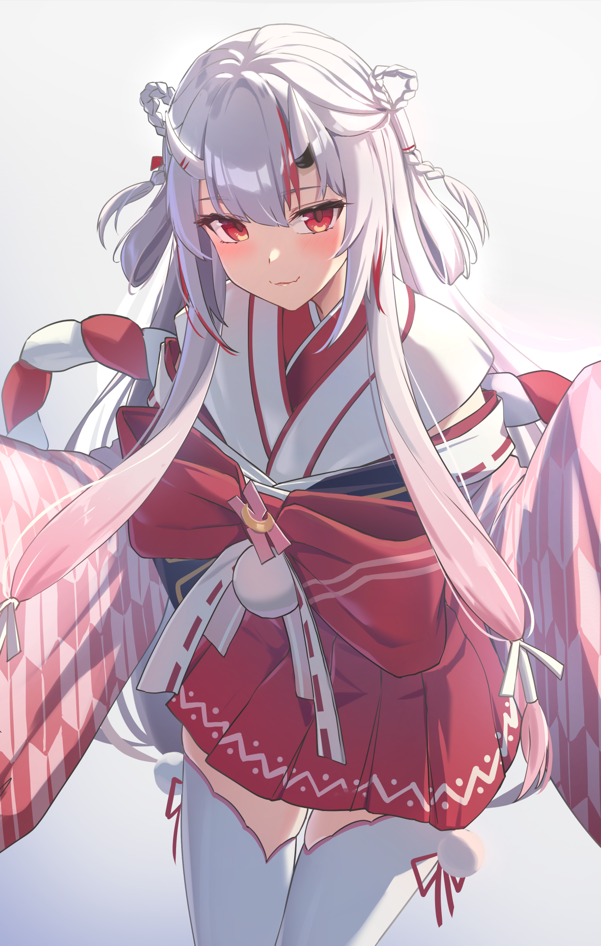 1girl closed_mouth gradient_background grey_background hakama highres hololive japanese_clothes looking_at_viewer miko multicolored_hair nakiri_ayame nakiri_ayame_(shrine_maiden) oni red_eyes red_hair red_hakama reulem smile solo streaked_hair thighhighs virtual_youtuber white_hair white_thighhighs