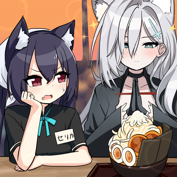 2girls :o animal_ear_fluff animal_ears arm_support black_choker black_gloves black_hair blue_archive blue_eyes blush bow bowl bowtie cat_ears cat_girl choker chopsticks collarbone commentary_request cross_hair_ornament fang food gloves grey_hair hair_between_eyes hair_ornament halo head_rest holding holding_chopsticks long_hair long_sleeves looking_at_another mismatched_pupils multiple_girls name_tag noodles official_alternate_costume own_hands_together praying ramen red_eyes serika_(blue_archive) serika_(waitress)_(blue_archive) shiroko_terror_(blue_archive) shooka short_sleeves sidelocks simple_background skin_fang sweatdrop twintails waitress white_headwear wolf_ears wolf_girl