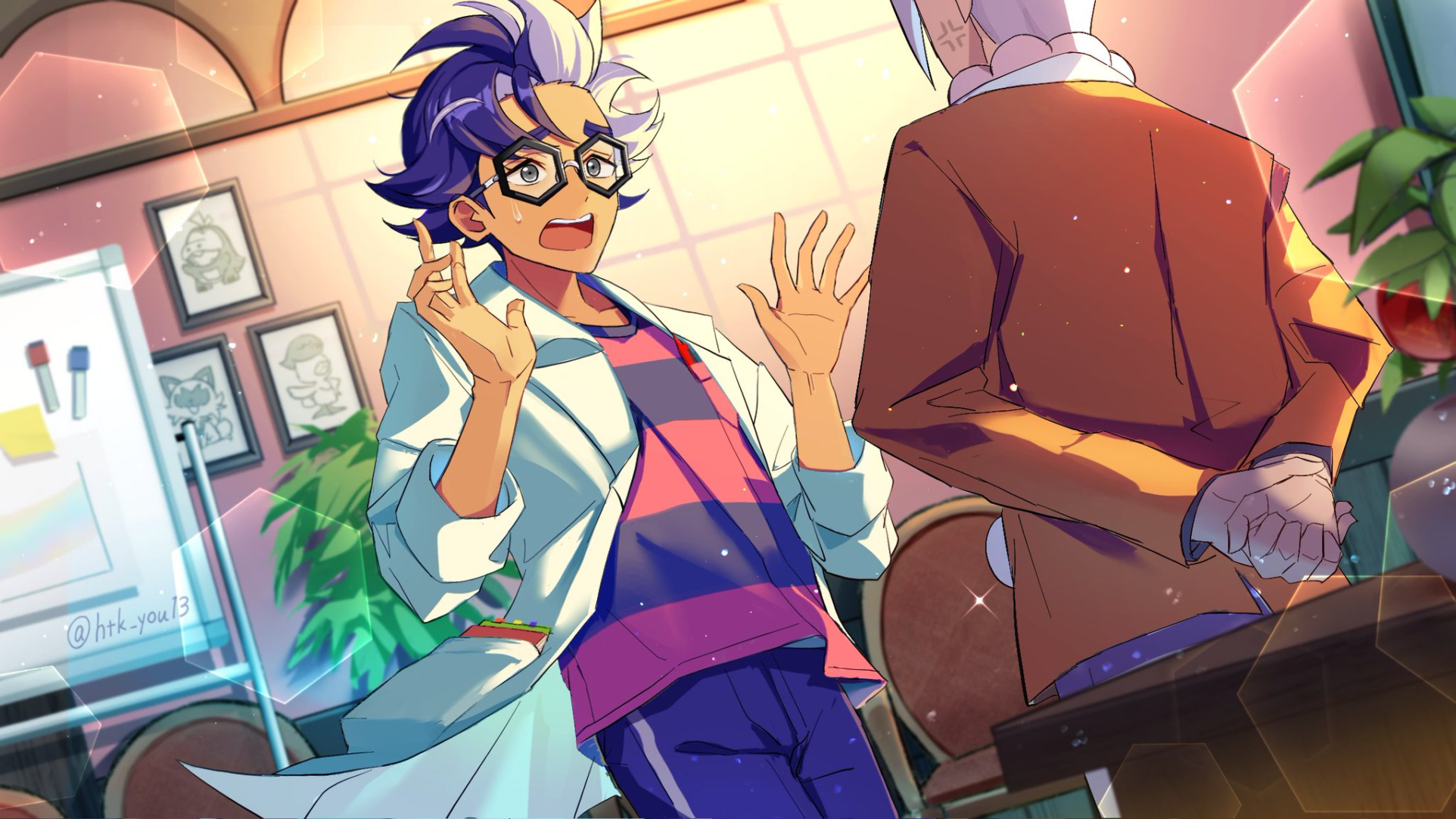 2boys anger_vein arms_behind_back black-framed_eyewear chair clavell_(pokemon) coat commentary_request desk fuecoco glasses grey_hair highres htk_you13 indoors jacket jacq_(pokemon) long_sleeves male_focus multiple_boys nintendo open_clothes open_coat open_mouth pants pokemon pokemon_sv quaxly shirt short_hair sparkle sprigatito standing striped_clothes striped_shirt sweatdrop teeth tongue upper_teeth_only watermark whiteboard