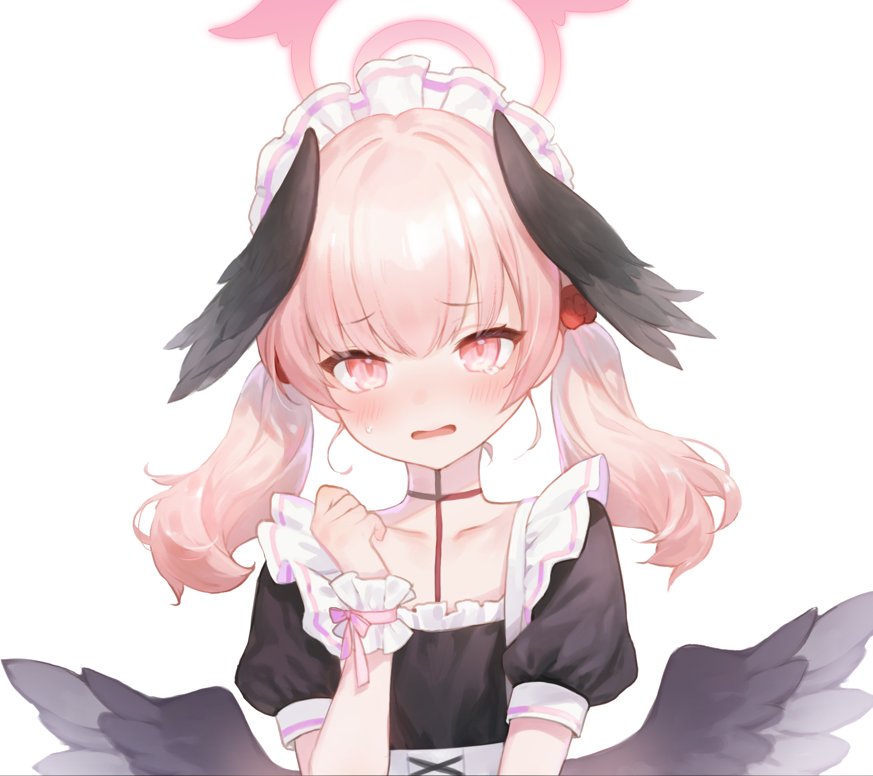 1girl adelie_cat alternate_costume angel_wings apron black_dress black_wings blue_archive blush commentary dress enmaided feathered_wings feathers frilled_apron frills hair_tie halo hand_up head_wings highres koharu_(blue_archive) low_wings maid maid_apron maid_headdress medium_hair parted_lips pink_eyes pink_hair pink_halo short_sleeves solo untranslatable_commentary twintails upper_body wings wrist_cuffs