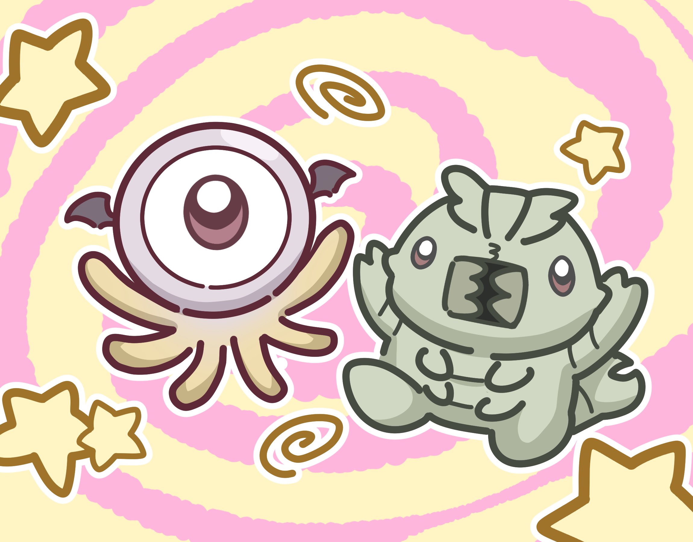bug chibi head_wings highres kato_takuji ma_no_mono-tachi mandibles monster no_humans one-eyed purple_eyes spiral star_(symbol) tentacles wings
