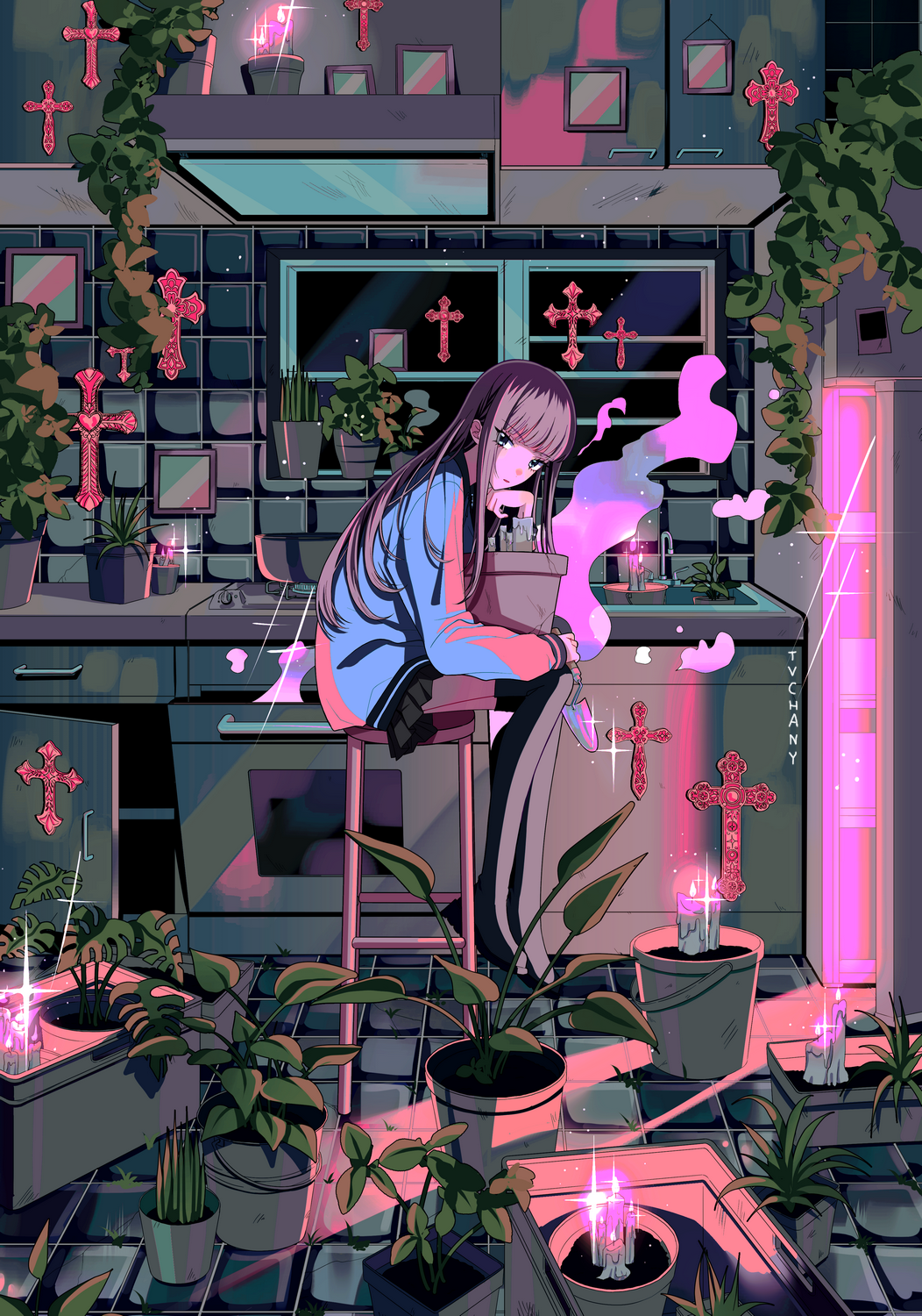 1girl black_boots boots brown_hair bucket candle crack cross drawer fire heart highres kitchen leaf long_hair long_sleeves looking_at_viewer myon_(tokipi) original oven plant potted_plant refrigerator shadow sink sitting solo stool thigh_boots tile_floor tiles trowel window