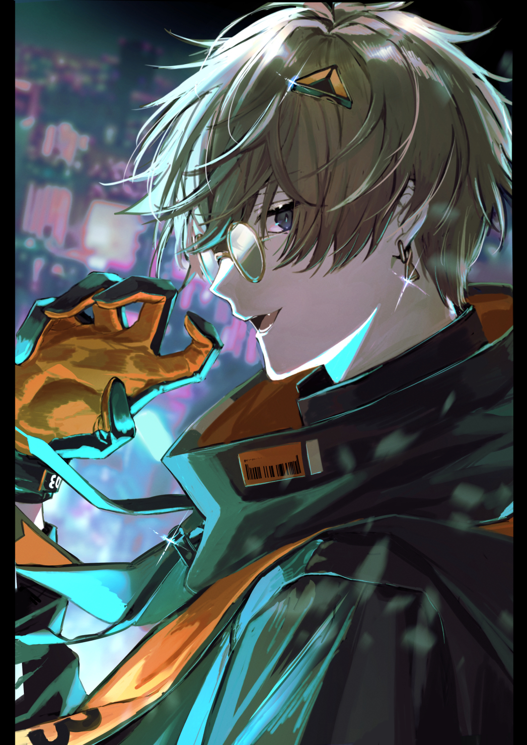1boy alban_knox alban_knox_(1st_costume) barcode black_jacket blue_eyes blurry blurry_background brown_hair cityscape earrings fang from_side gloves hair_between_eyes highres jacket jewelry looking_at_viewer male_focus nijisanji nijisanji_en open_mouth outdoors pillarboxed profile round_eyewear solo sonomi sparkle upper_body virtual_youtuber