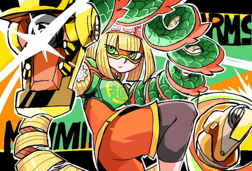 1girl 3600gt arms_(game) blonde_hair domino_mask dragon_(arms) eye_mask fighting_stance green_eyes leg_up mask min_min_(arms) ramram_(arms) short_hair solo