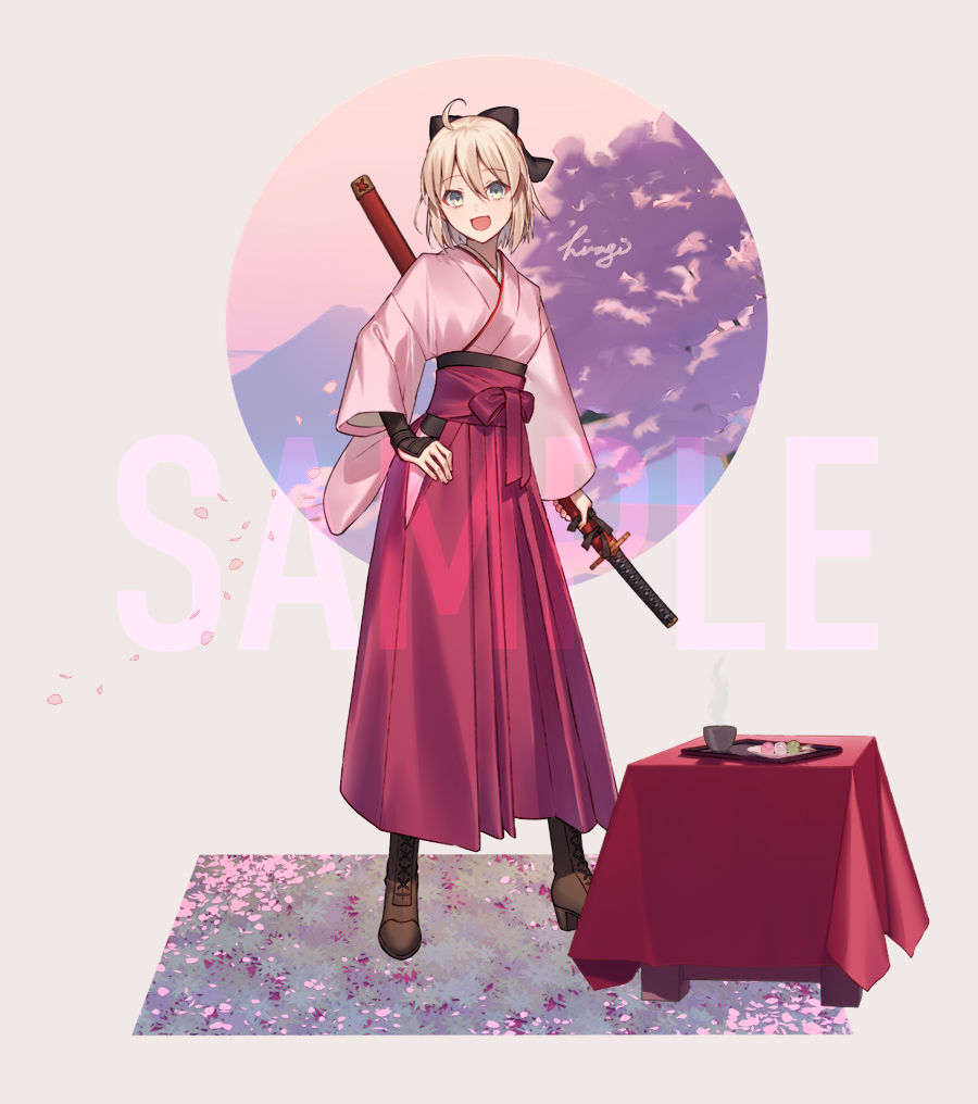 1girl ahoge black_bow blonde_hair boots bow brown_boots commentary_request fate/grand_order fate_(series) green_eyes hair_between_eyes hair_bow hand_on_own_hip hiiragi_(karashriker) holding holding_sword holding_weapon japanese_clothes katana kimono koha-ace obi okita_souji_(fate) okita_souji_(first_ascension)_(fate) okita_souji_(koha-ace) open_mouth pink_kimono sample_watermark sash sheath sheathed smile solo sword table watermark weapon
