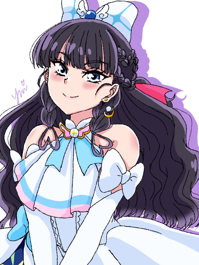 1girl ascot black_hair blue_eyes blush bow cosplay cure_prism cure_prism_(cosplay) delicious_party_precure dress earrings elbow_gloves glove_bow gloves hair_ornament hirogaru_sky!_precure in-franchise_crossover jewelry kasai_amane long_hair looking_at_viewer magical_girl precure smile solo upper_body white_ascot white_background white_dress white_gloves wing_hair_ornament yui_u86