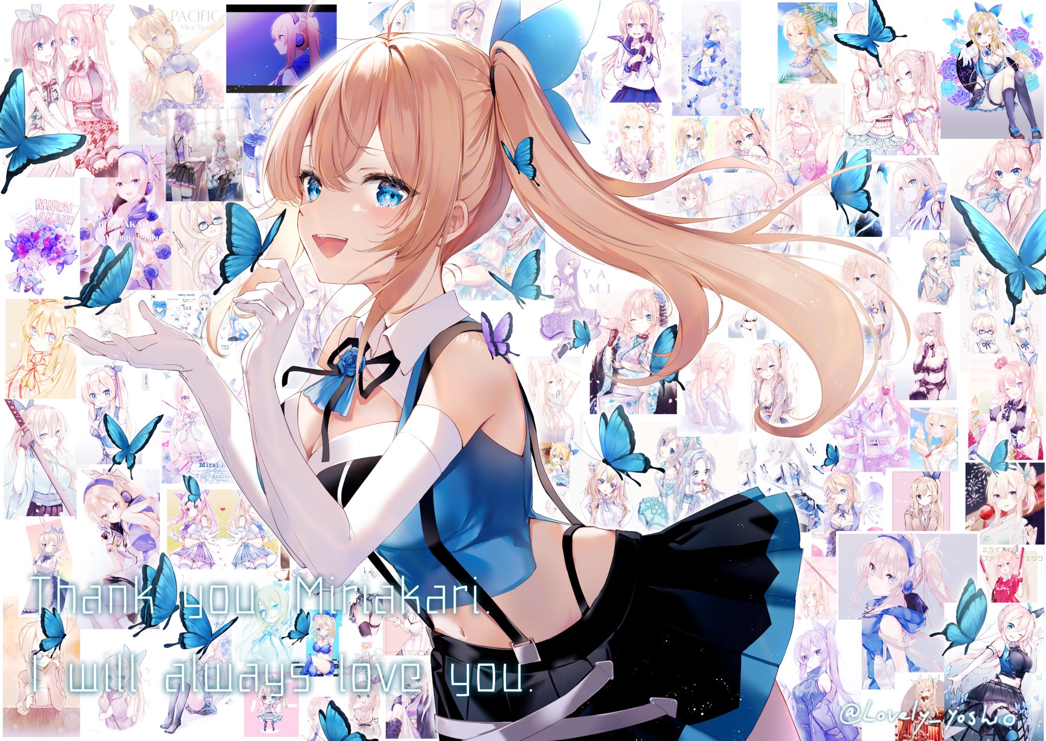 1girl blonde_hair blue_eyes blue_flower breasts elbow_gloves flower gloves highres large_breasts long_hair lovely_yoshio mirai_akari mirai_akari_project open_mouth side_ponytail skirt smile virtual_youtuber white_gloves
