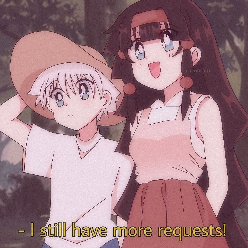 1boy 1girl alluka_zoldyck arms_behind_back black_hair blue_eyes blue_shorts blush brother_and_sister cheonsaru child closed_mouth dress english_text forest hairband hand_on_own_head hat hunter_x_hunter killua_zoldyck long_hair looking_to_the_side multi-tied_hair nature open_mouth outdoors red_dress shirt short_hair shorts siblings smile white_hair white_shirt
