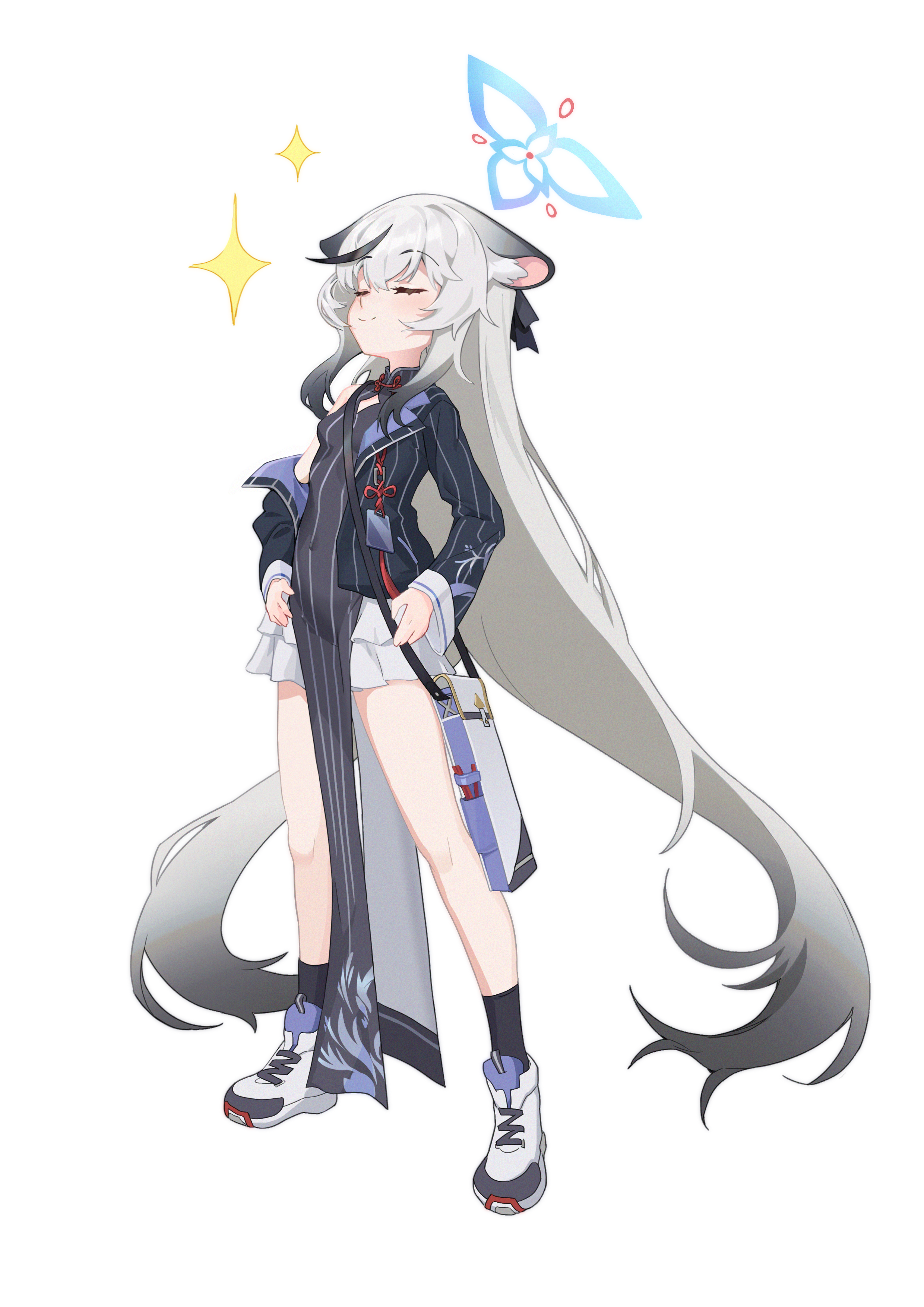 0.7_(aysatnegr) 1girl absurdres animal_ear_fluff animal_ears bag black_dress black_hair black_jacket black_socks blue_archive breast_cutouts breasts closed_eyes dress frilled_skirt frills full_body grey_hair halo hands_on_own_hips highres jacket kneehighs kokona_(blue_archive) long_hair multicolored_hair off_shoulder pelvic_curtain shoes shoulder_bag sidelocks simple_background skirt small_breasts smile sneakers socks solo sparkle streaked_hair striped_clothes striped_dress striped_jacket tiger_ears tiger_girl vertical-striped_clothes vertical-striped_dress vertical-striped_jacket very_long_hair white_background