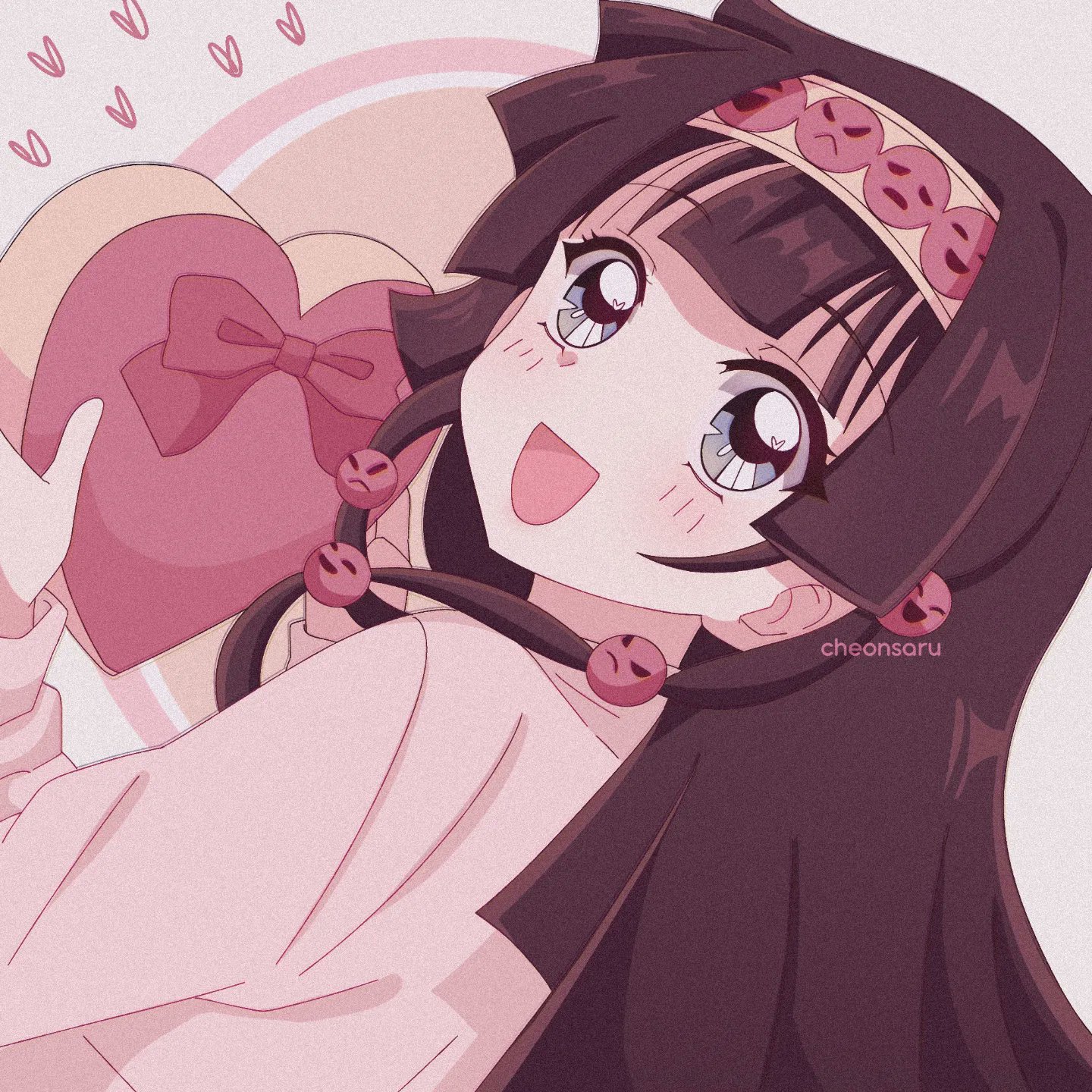 1girl alluka_zoldyck black_hair blue_eyes blush bow cheonsaru child hair_ornament hairband heart highres holding hunter_x_hunter long_hair long_sleeves looking_at_viewer multi-tied_hair pink_bow shirt signature smile solo white_shirt