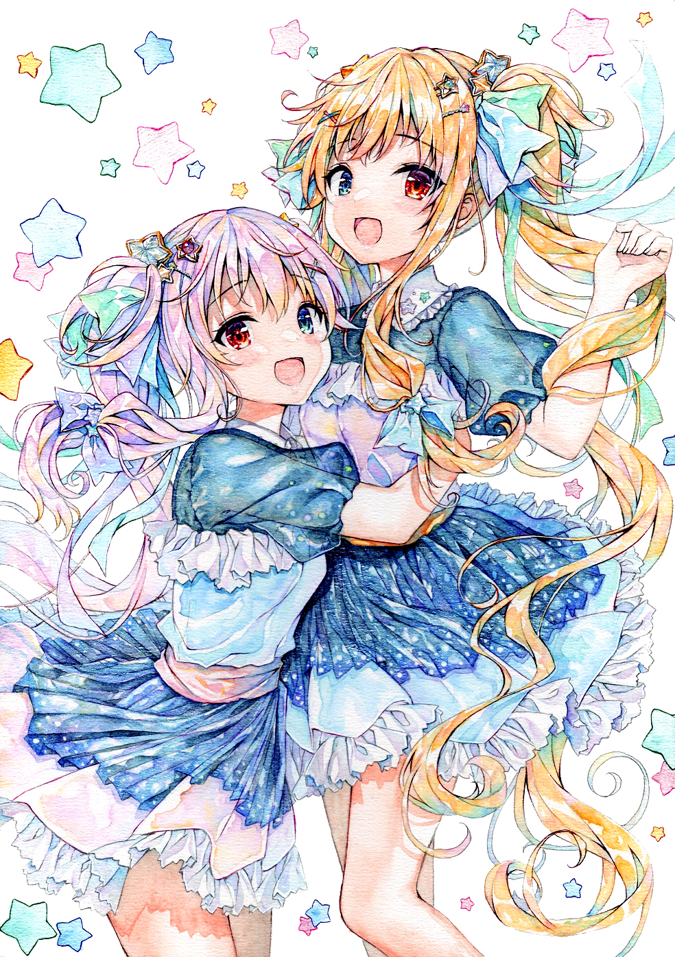 2girls :d blonde_hair blue_bow blue_eyes blue_skirt blush bow commentary_request feet_out_of_frame frilled_skirt frills hair_bow hair_ornament hairclip hand_up heterochromia highres hug long_hair mizuki_yuuma multiple_girls open_mouth original painting_(medium) pink_hair puffy_short_sleeves puffy_sleeves red_eyes shirt short_sleeves simple_background skirt smile standing star_(symbol) star_hair_ornament star_symbol_background traditional_media twintails very_long_hair watercolor_(medium) white_background white_shirt