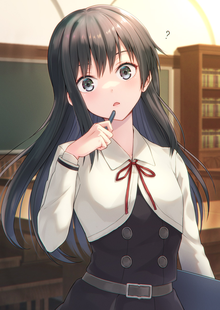 1girl ? asashio_(kancolle) asashio_kai_ni_(kancolle) belt black_dress black_hair blurry blurry_background blush bookshelf dress grey_belt grey_eyes highres holding holding_pen indoors kanden_sky kantai_collection long_hair long_sleeves open_mouth pen red_ribbon ribbon sidelocks solo upper_body