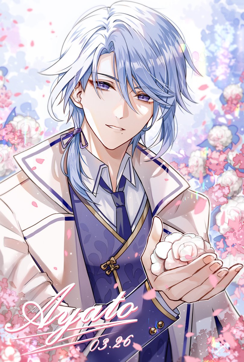 1boy aguaaaaa4 blue_flower blue_hair blue_necktie bow buttons character_name cherry_blossoms collared_jacket collared_shirt dated fingernails flower genshin_impact hair_between_eyes hair_bow hands_up highres holding holding_flower jacket kamisato_ayato long_sleeves looking_at_viewer male_focus medium_hair mole mole_under_mouth nail_polish necktie open_clothes open_jacket outdoors own_hands_together petals pink_flower pink_nails purple_bow purple_eyes purple_vest shirt sky smile solo sparkle standing teeth vest white_flower white_jacket white_shirt white_sky wing_collar