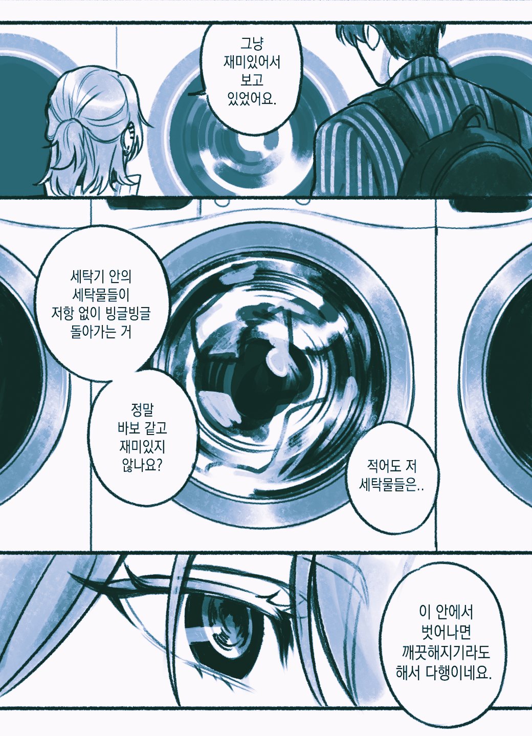 2boys backpack bag blue_theme comic commentary_request ear_piercing eoduun_badaui_deungbul-i_doeeo highres kim_jaehee korean_commentary korean_text male_focus monochrome multiple_boys padakpadak_88 park_moo-hyun piercing ponytail shirt short_hair speech_bubble striped_clothes striped_shirt translation_request vertical-striped_clothes vertical-striped_shirt washing_machine