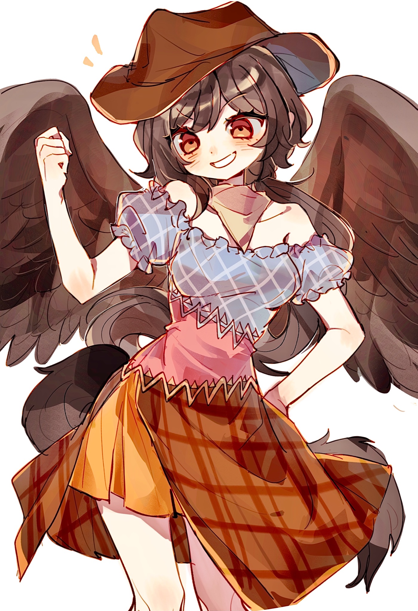 1girl :d bandana black_hair black_wings brown_hat commentary_request cowboy_hat dress hat highres horse_tail kurokoma_saki multicolored_dress off-shoulder_dress off_shoulder open_mouth pegasus_wings red_eyes short_hair simple_background smile springarashi02 tail touhou v-shaped_eyebrows white_background wings