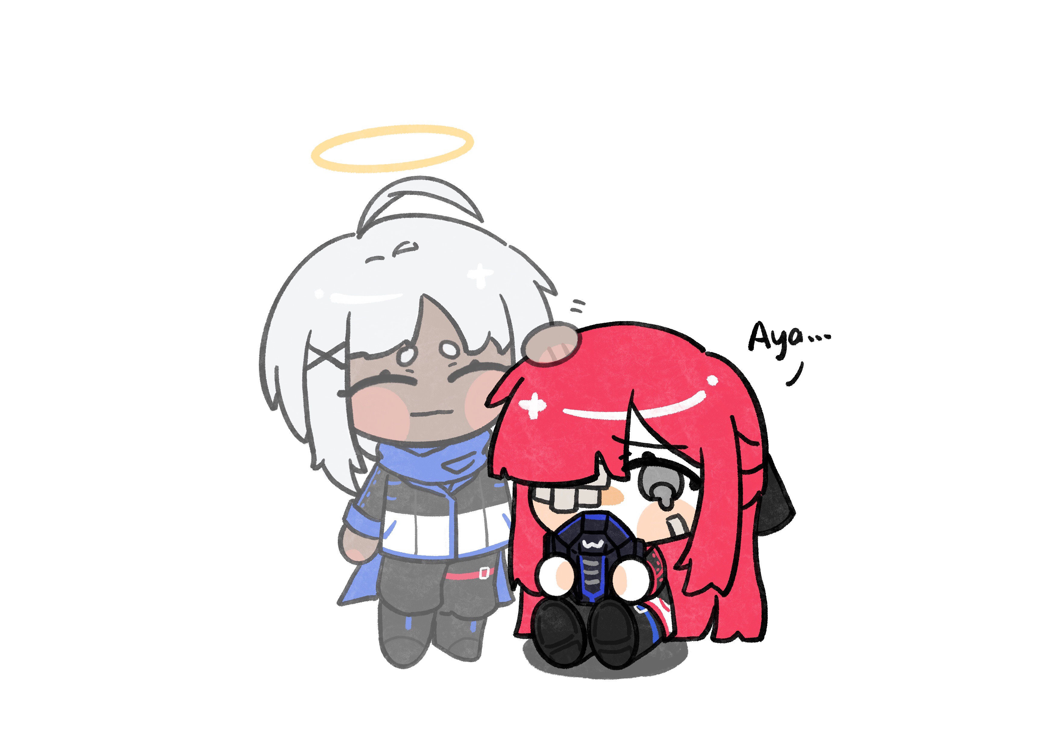 2girls absurdres ahoge aya_(project_moon) bandage_on_face bandage_over_one_eye bandages black_jacket black_pants black_ribbon blue_scarf blush_stickers chibi closed_eyes commentary dark-skinned_female dark_skin english_commentary ghost grey_eyes hair_ribbon halo headpat highres jacket limbus_company long_hair long_sleeves medium_hair multiple_girls pants pink_hair project_moon ribbon scarf simple_background single_tear sitting skathi54484 white_background white_hair yuri_(project_moon)