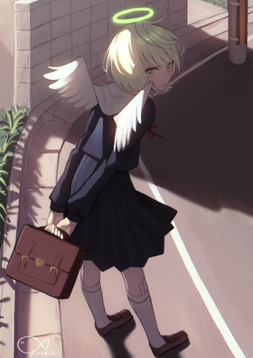 1girl angel angel_wings bag blonde_hair blush eyebrows_hidden_by_hair hair_between_eyes halo highres looking_at_viewer looking_back okakasushi original outdoors road school_bag school_uniform shadow short_hair smile solo wings yellow_eyes