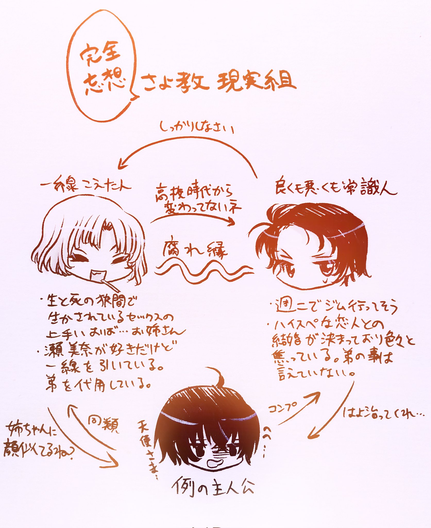 1boy 2girls ahoge aya_carmine chibi cigarette closed_eyes greyscale head_only highres hitomi_hirosuke_(sayonara_wo_oshiete) millipen_(medium) monochrome multiple_girls oomori_tonae open_mouth pen_(medium) relationship_graph sayonara_wo_oshiete short_hair simple_background smile sweatdrop takashima_semina traditional_media translation_request wavy_mouth
