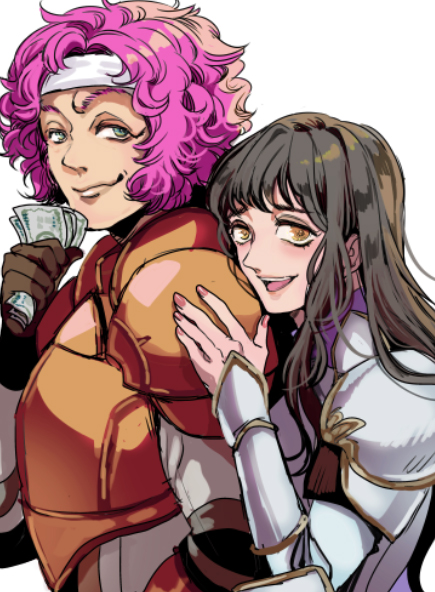 armor astrid_(fire_emblem) banknote black_hair blue_eyes couple fire_emblem fire_emblem:_path_of_radiance hetero holding holding_money hug hug_from_behind looking_at_viewer makalov_(fire_emblem) money nintendo open_mouth pink_hair smile tsuko_(25mnts) yellow_eyes